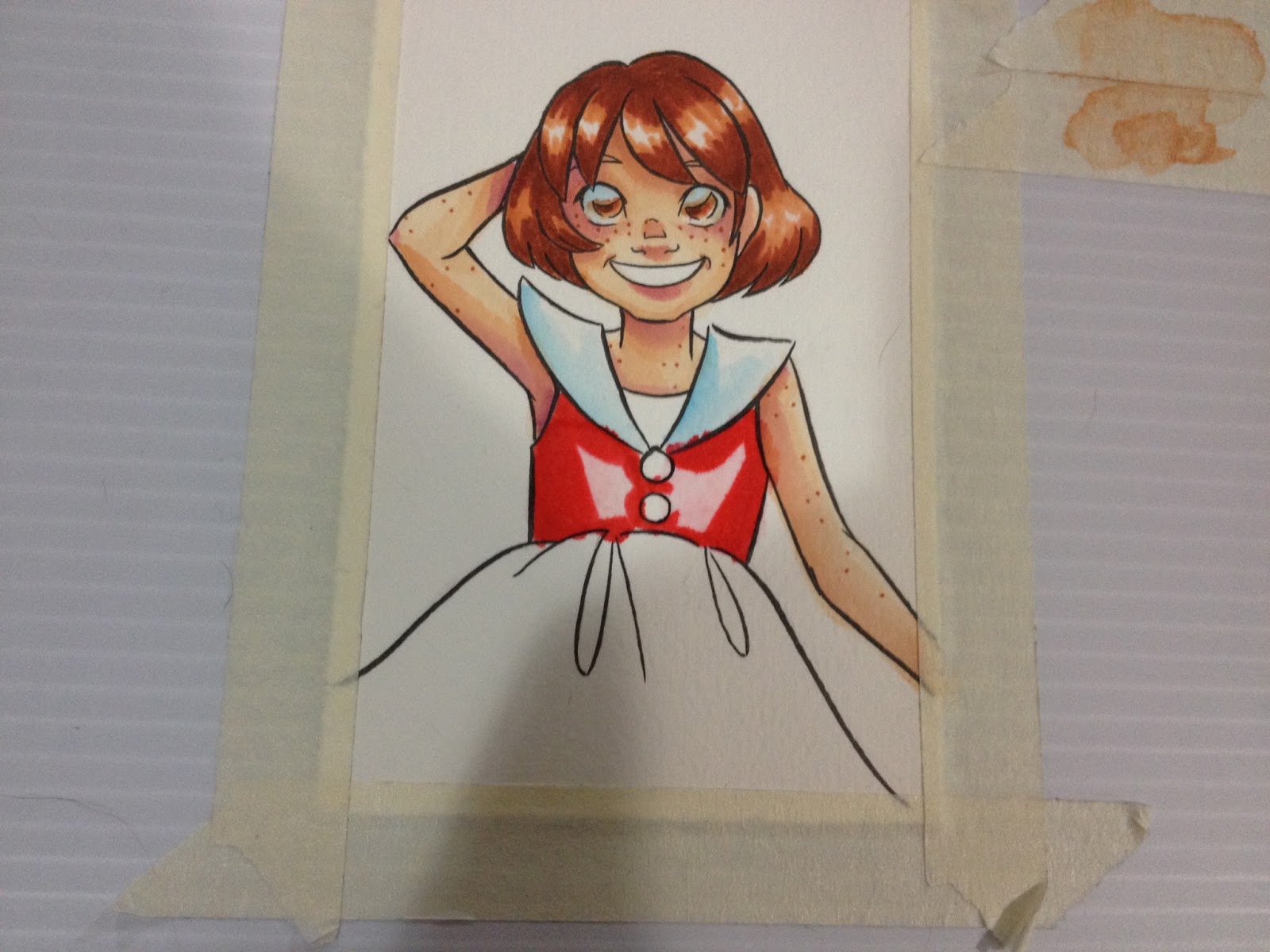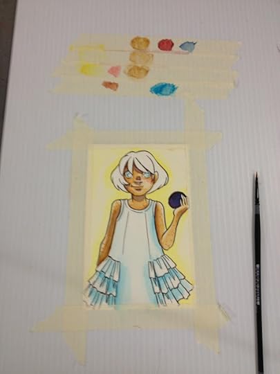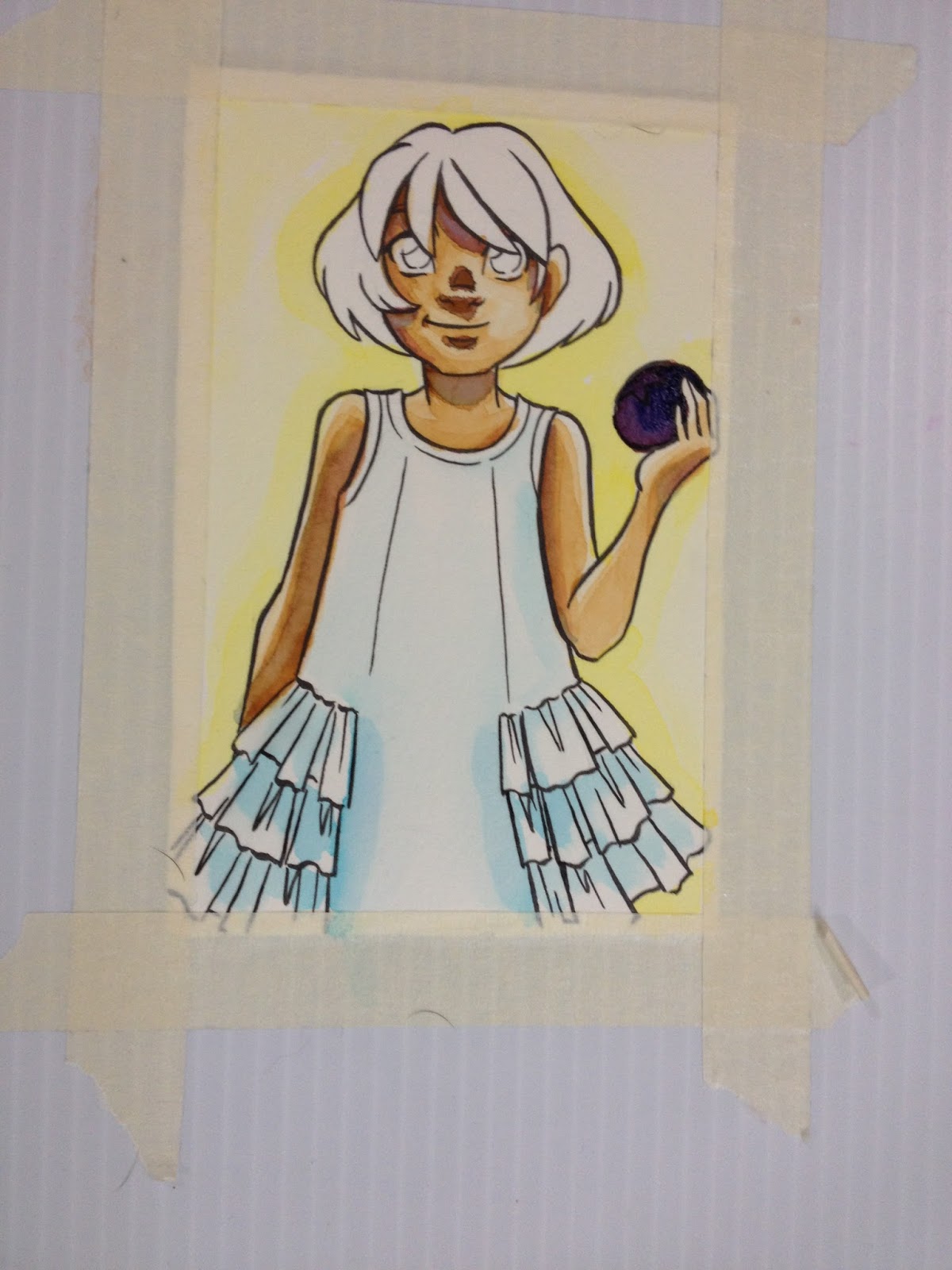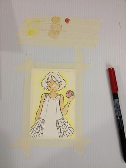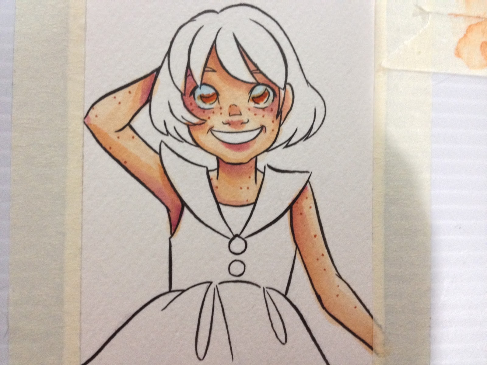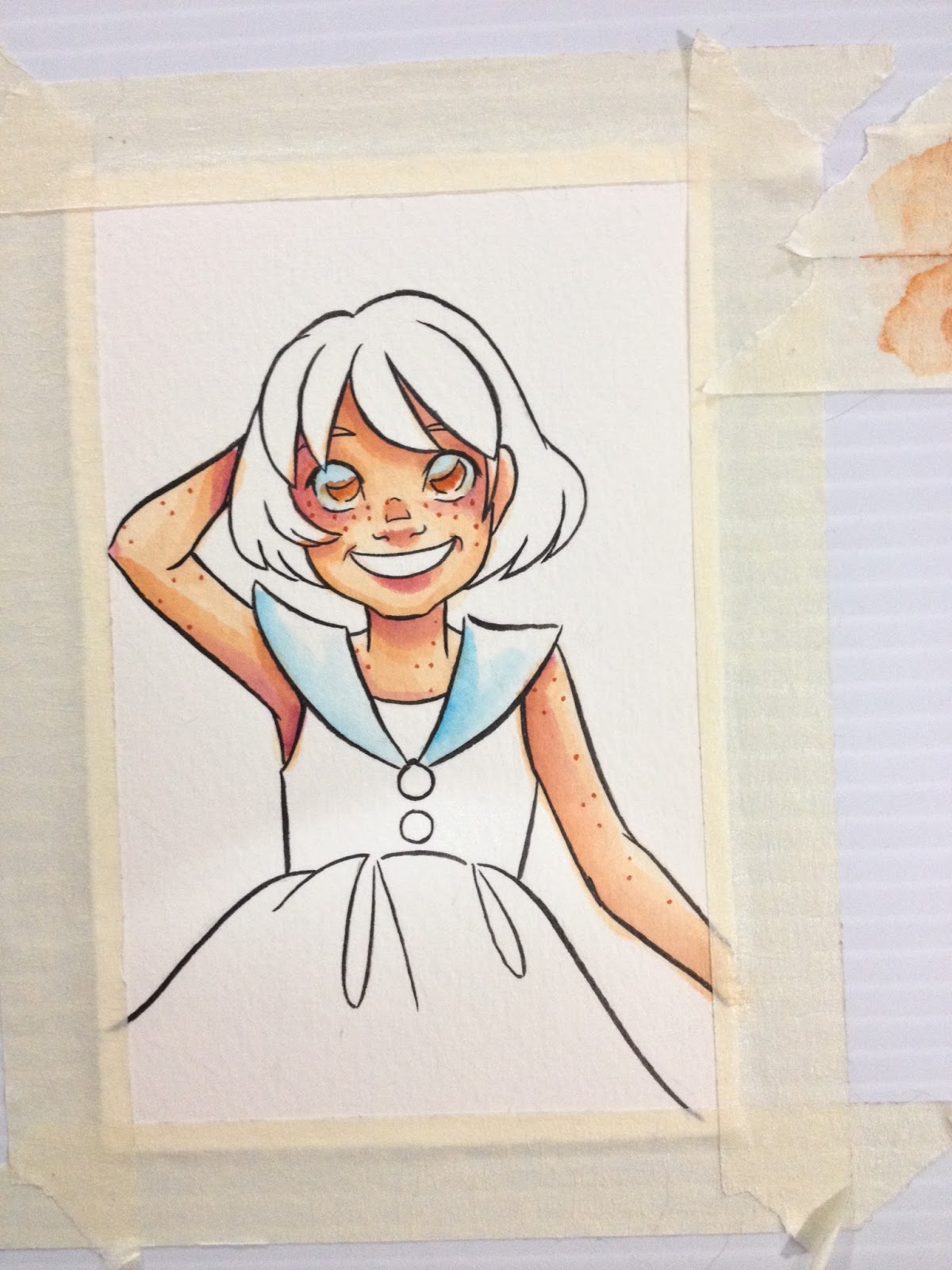 For the purposes of this review, I sketched out a little Kara, inked her with the Sailor Mitsuo Aida, as it's waterproof and a fude pen, and let that dry for 24 hours before erasing the pencil. I then taped that sucker down, and started laying down some color. I used Fabriano Medioevalis 208 S, because I have a 100 pack of these little cards, which is a fairly soft watercolor paper.