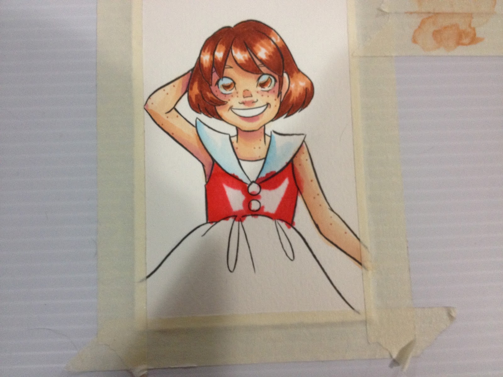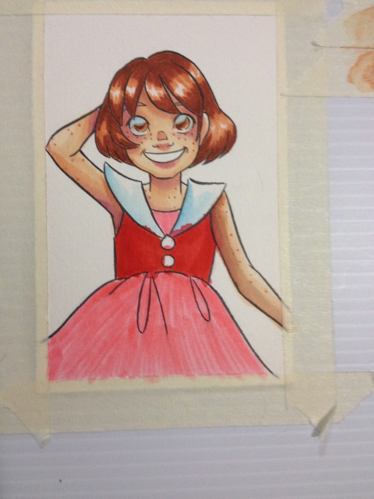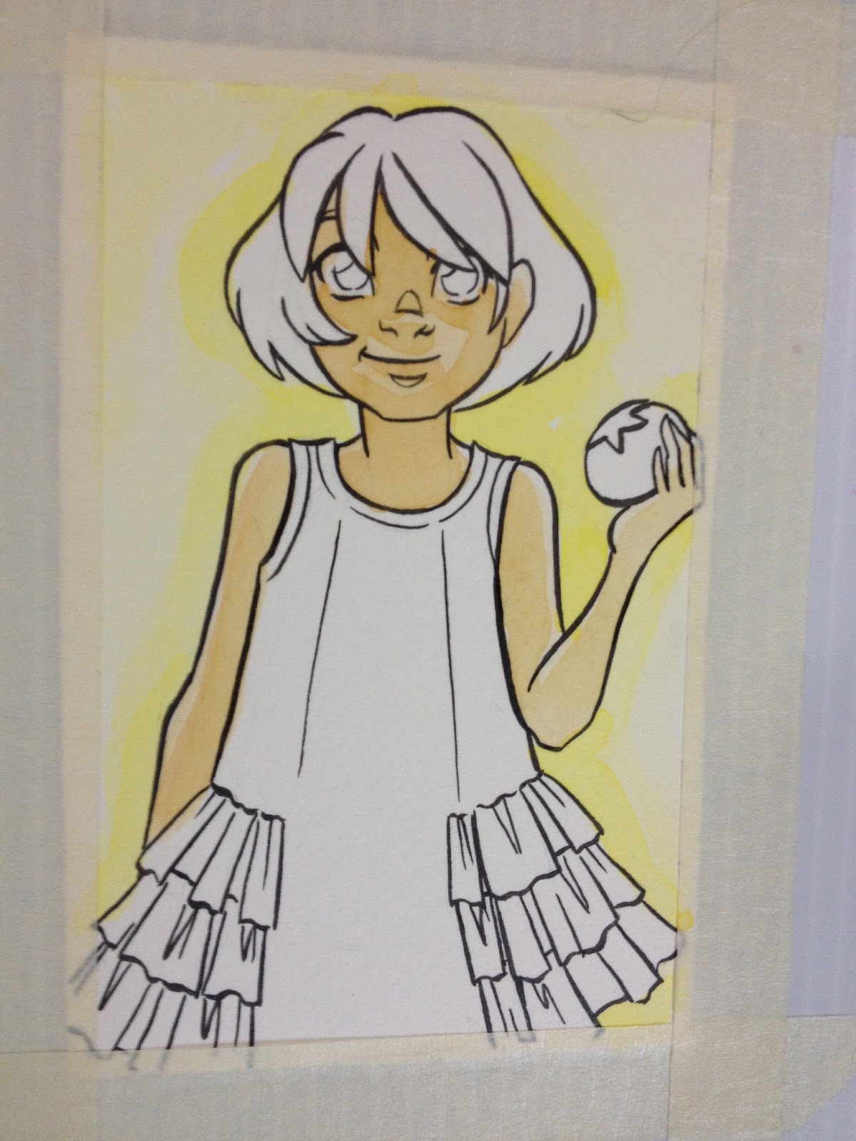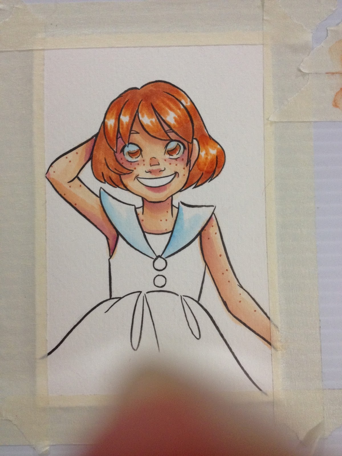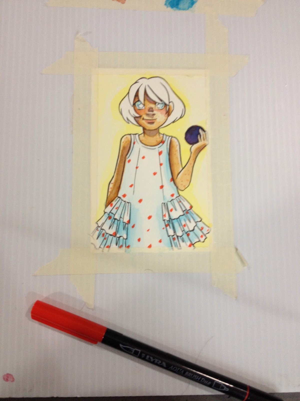 For the purposes of this review, I sketched out a little Kara, inked her with the Sailor Mitsuo Aida, as it's waterproof and a fude pen, and let that dry for 24 hours before erasing the pencil. I then taped that sucker down, and started laying down some color. I used Fabriano Medioevalis 208 S, because I have a 100 pack of these little cards, which is a fairly soft watercolor paper.
