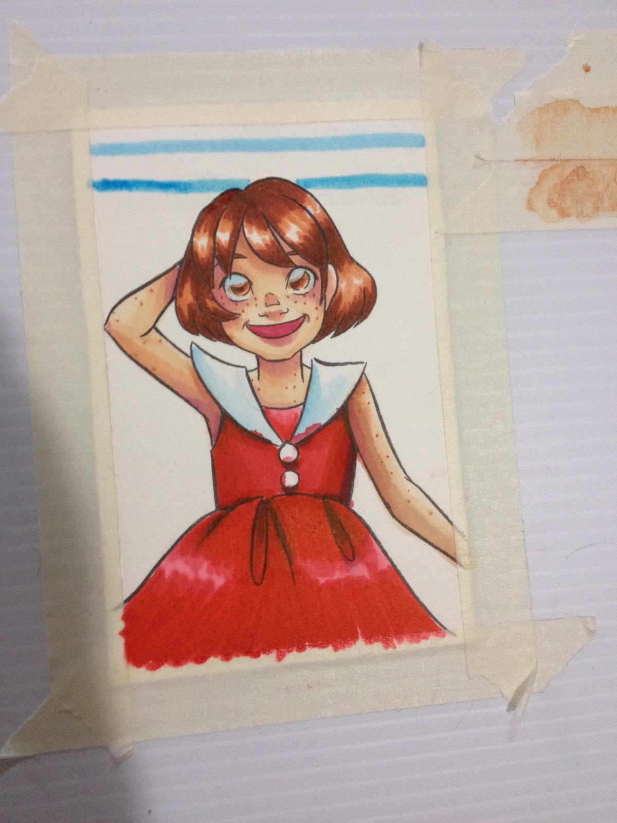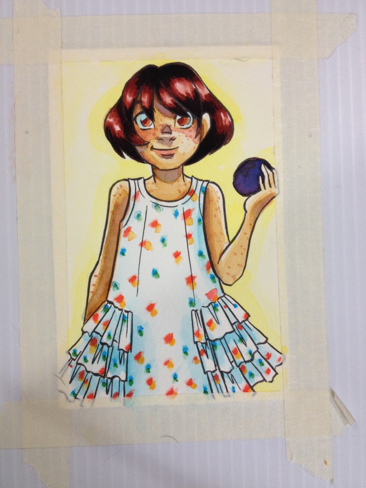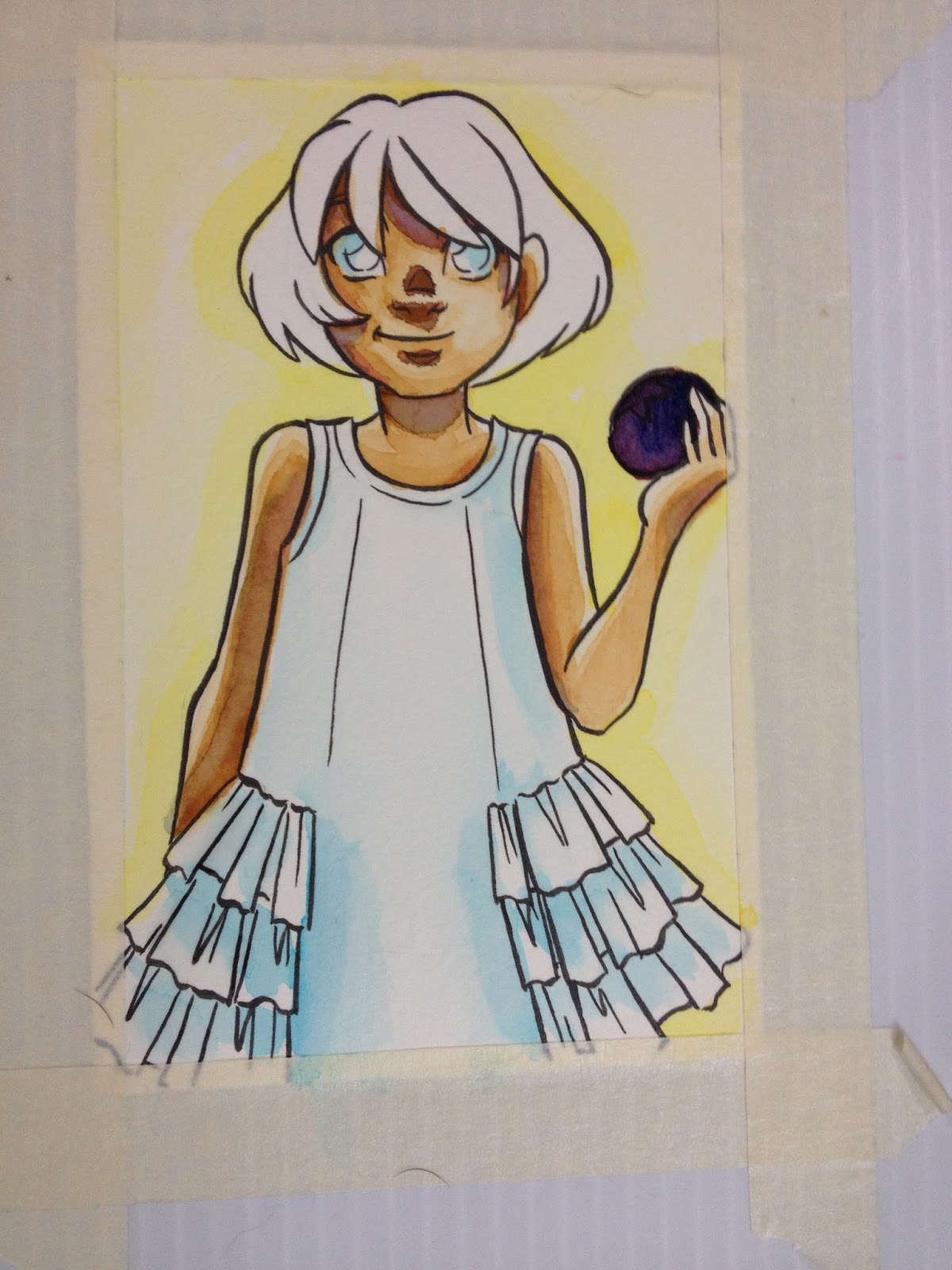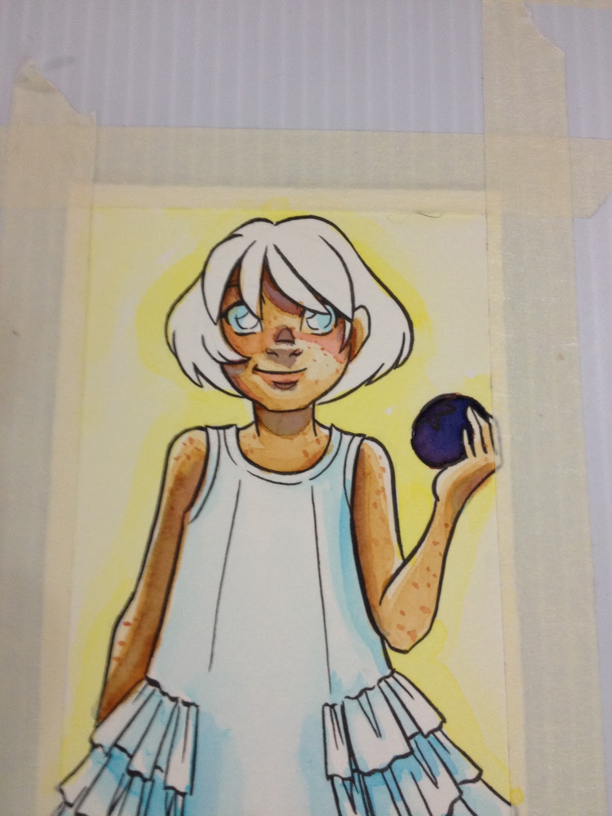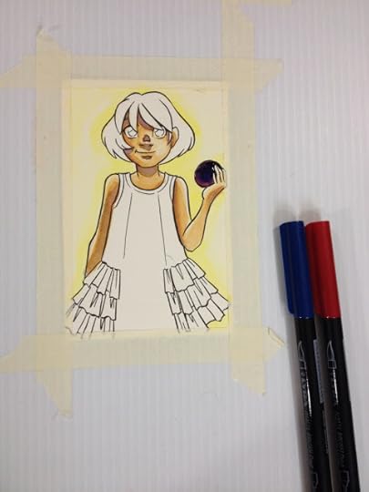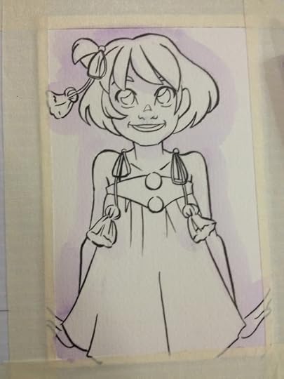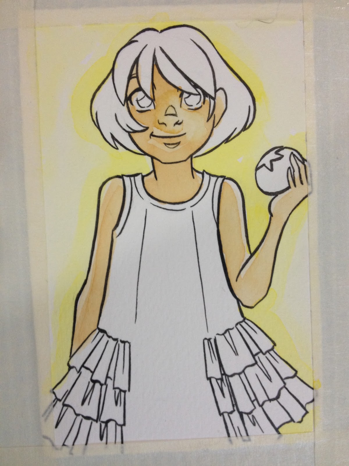 For the purposes of this review, I sketched out a little Kara, inked her with the Sailor Mitsuo Aida, as it's waterproof and a fude pen, and let that dry for 24 hours before erasing the pencil. I then taped that sucker down, and started laying down some color. I used Fabriano Medioevalis 208 S, because I have a 100 pack of these little cards, which is a fairly soft watercolor paper.