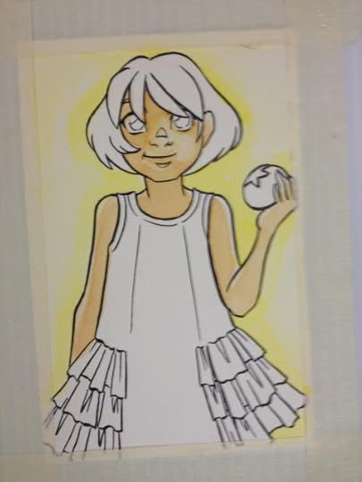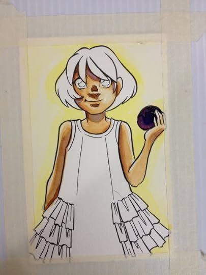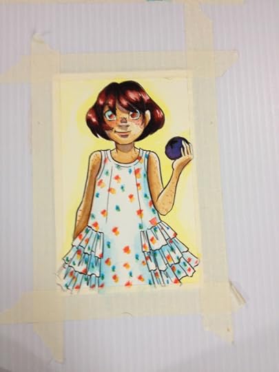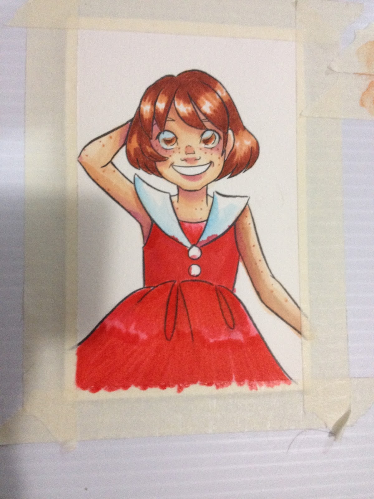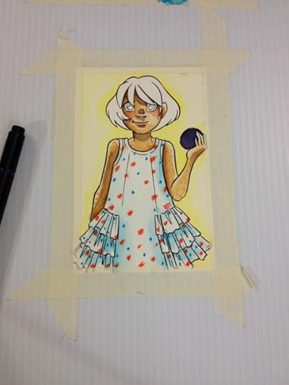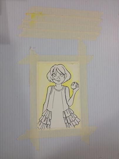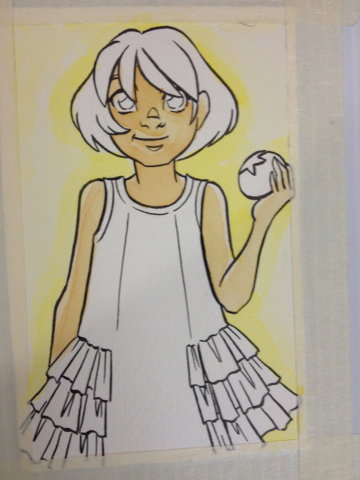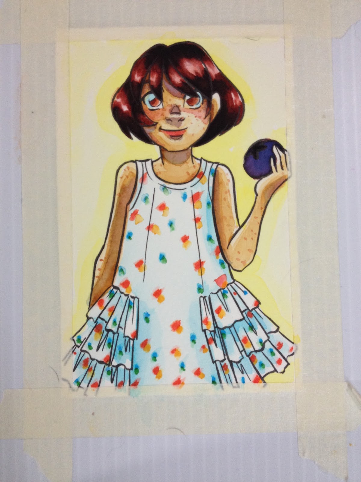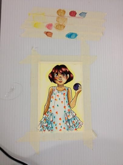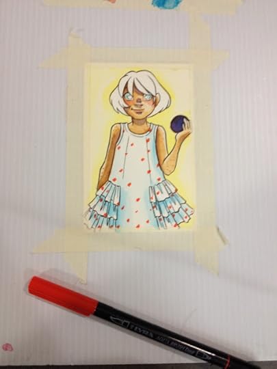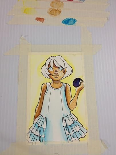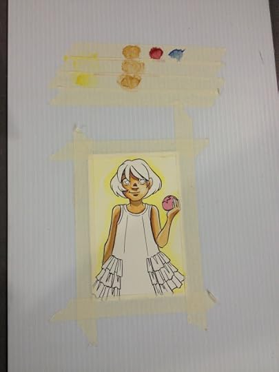 For the purposes of this review, I sketched out a little Kara, inked her with the Sailor Mitsuo Aida, as it's waterproof and a fude pen, and let that dry for 24 hours before erasing the pencil. I then taped that sucker down, and started laying down some color. I used Fabriano Medioevalis 208 S, because I have a 100 pack of these little cards, which is a fairly soft watercolor paper.