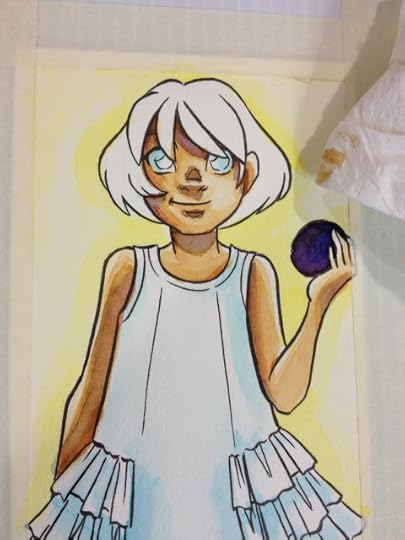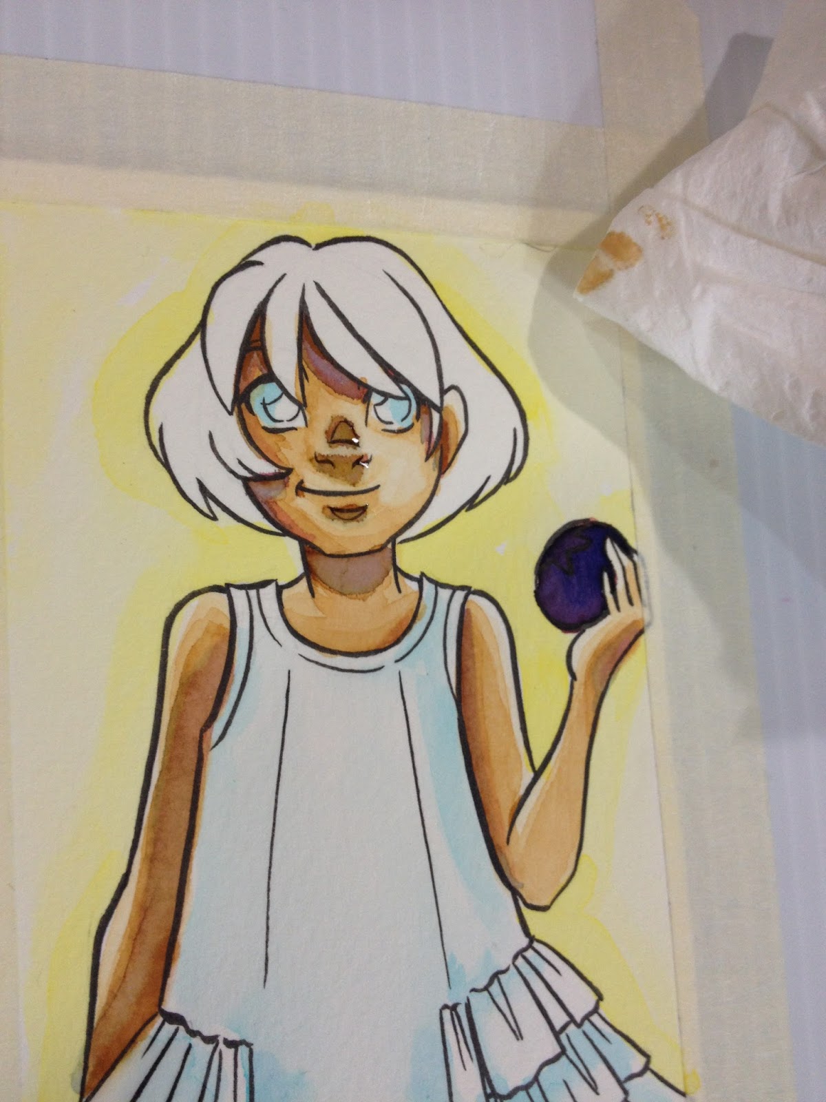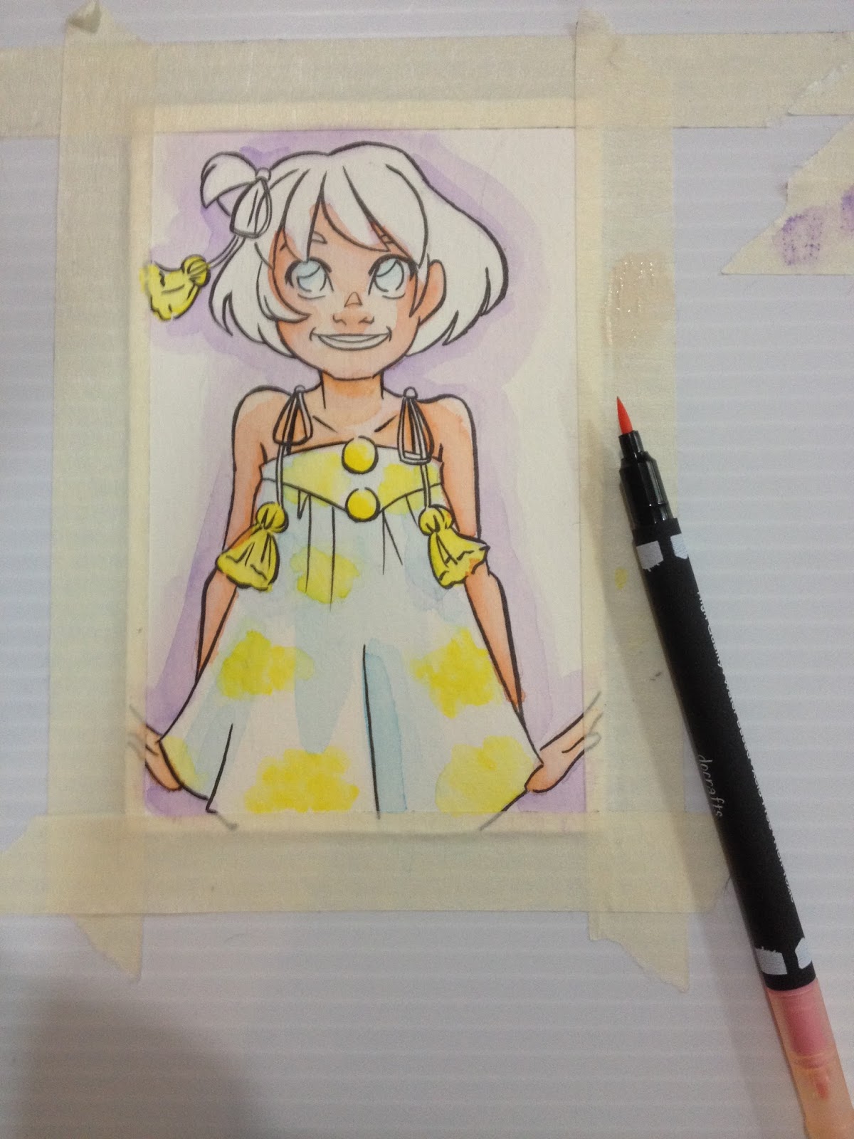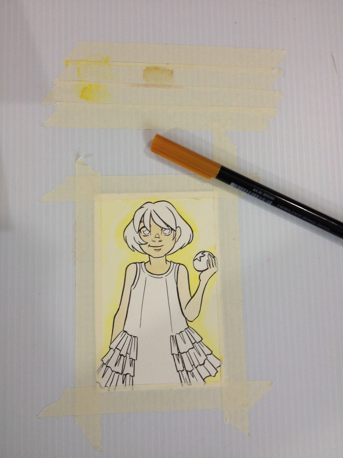 I opted to apply the background first: A nice violet to contrast with the yellow I planned on using for the dress. I applied the color using the bullet nib on the masking tape, and then used a wet brush to mix the color and apply it to the paper.