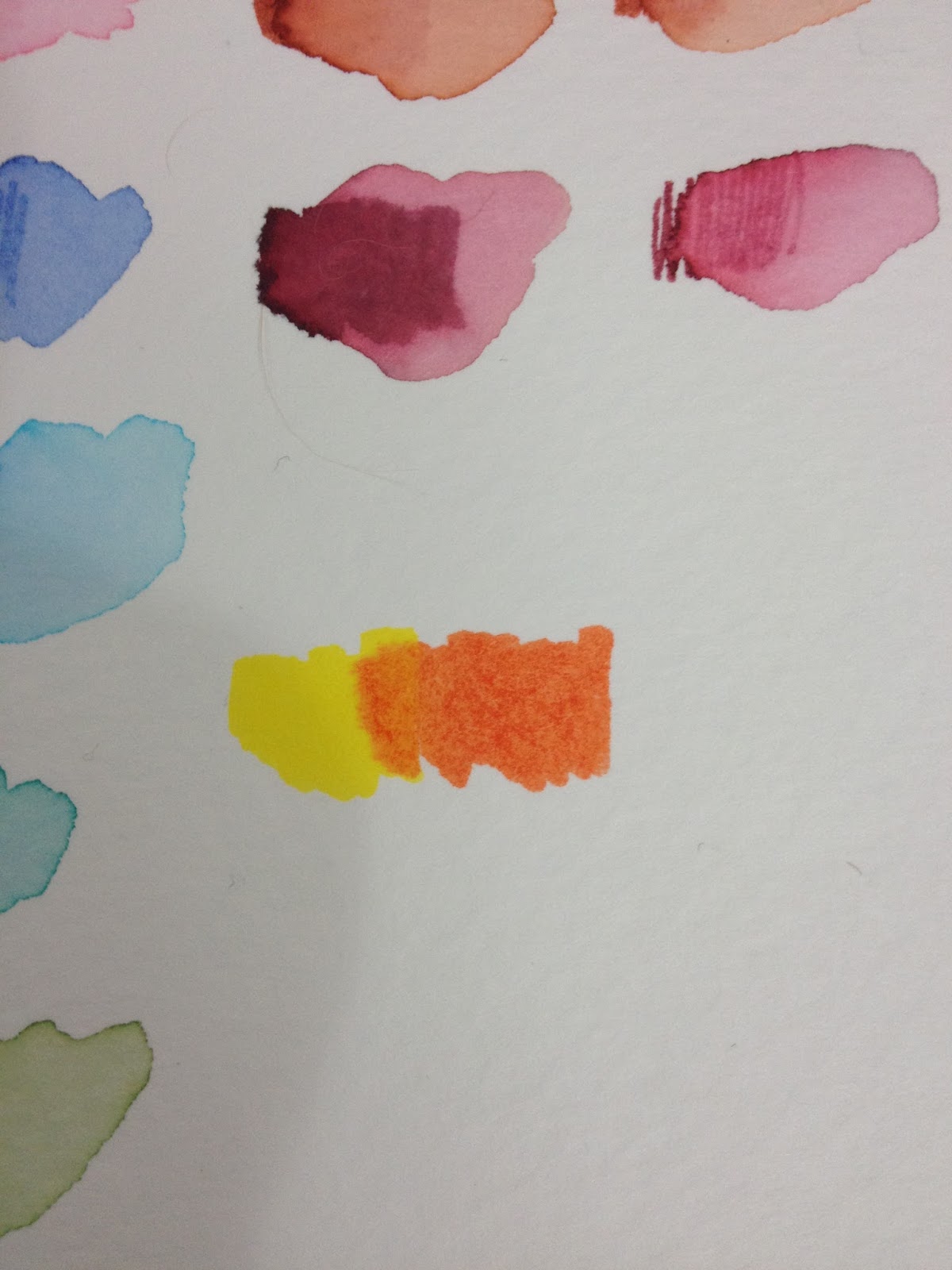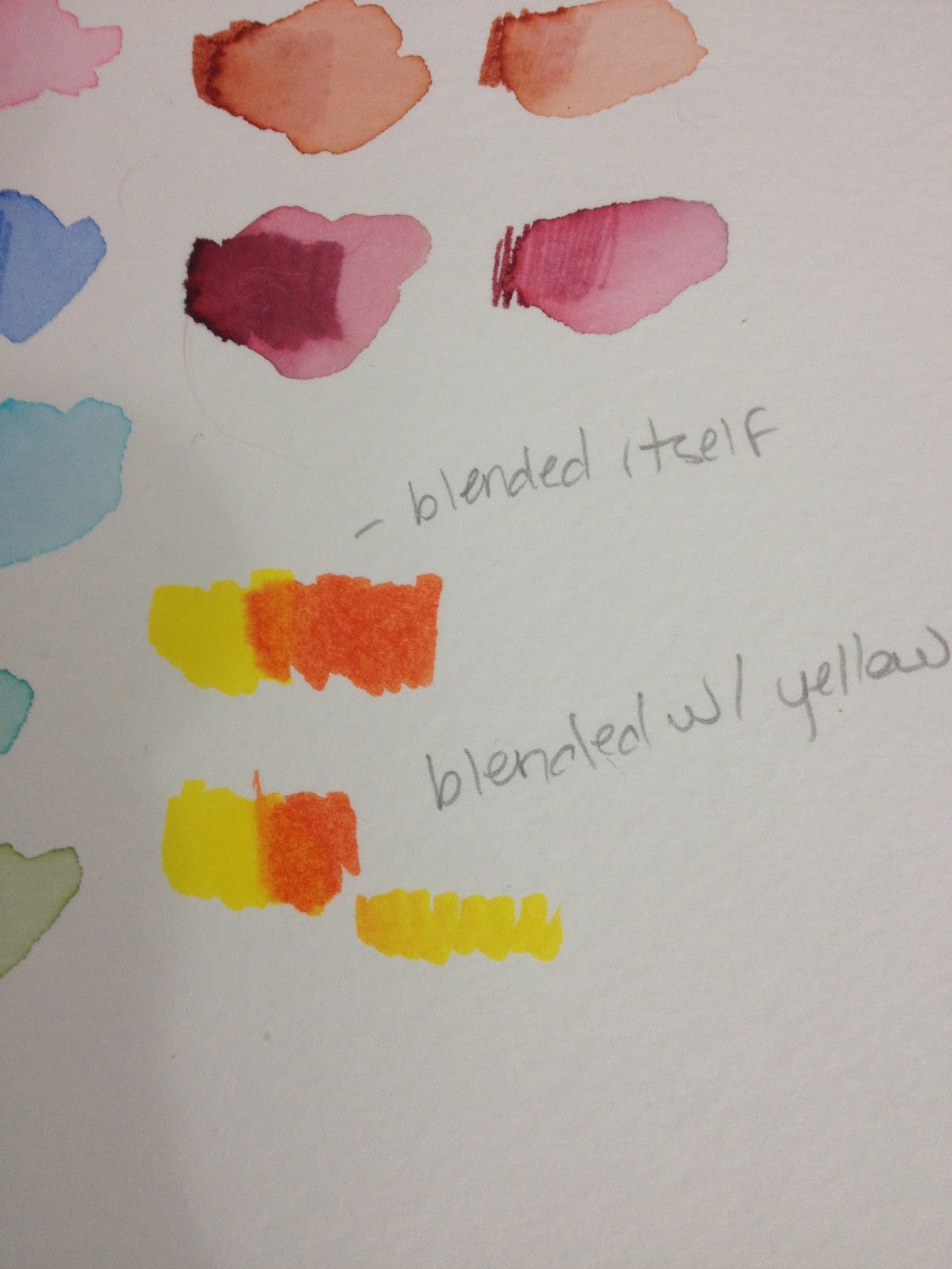 And these were blended into each other a little bit, and then I used the yellow to blend into the red. Beneath that is me cleaning the brush, demonstrating yet another blending technique.