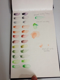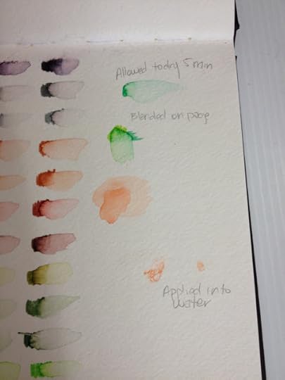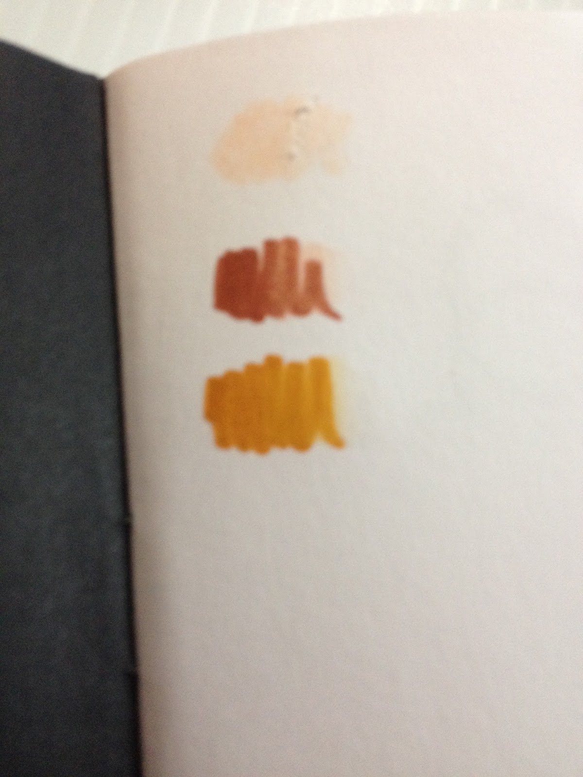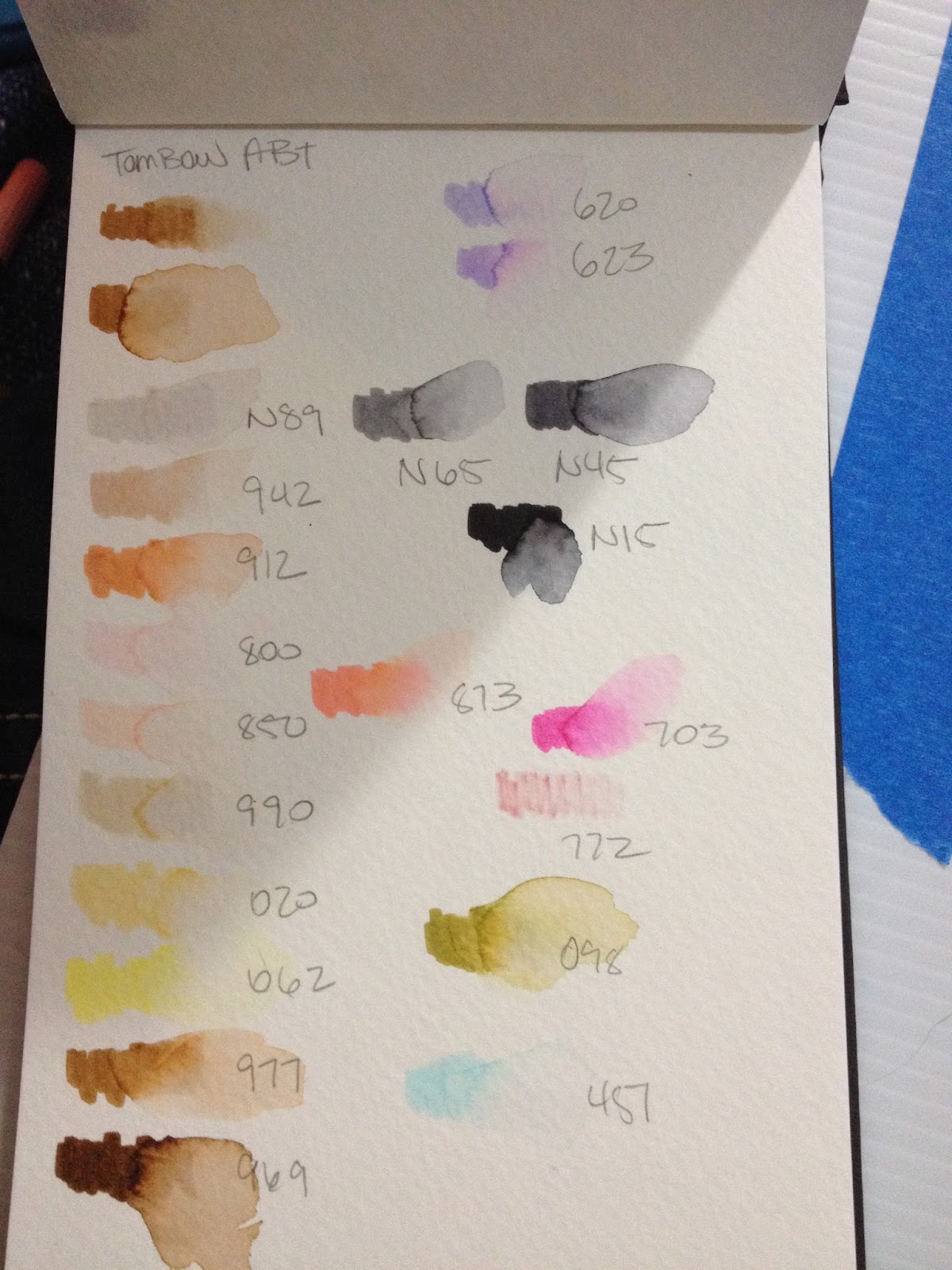 The swatches I made in my swatchbook really come in handy when actually painting, because the caps on the markers, while really cute, are too translucent to really be color accurate, and the colors do change slightly when water is applied and brushed out.