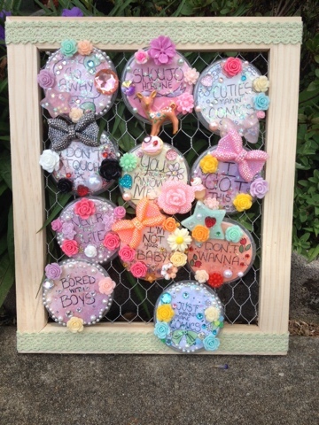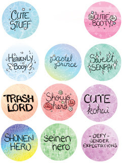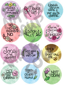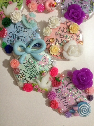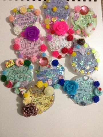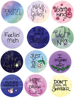 I'm testing new designs, so I have one of each (save for a couple designs people notified me about wanting on Tumblr), so if you like one in particular, make sure you swing by on Friday to get it. I'll also have plenty of the original 13 designs, all super glittery and cute, that should be available all weekend. Sassy buttons are $4 each, or any three designs that I have for $10.