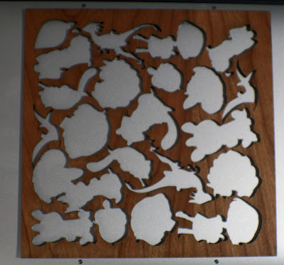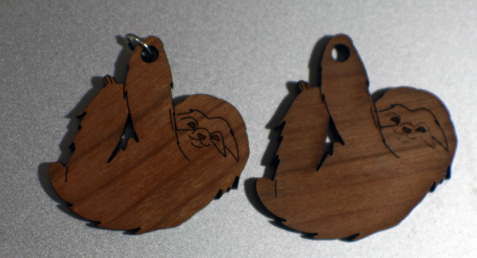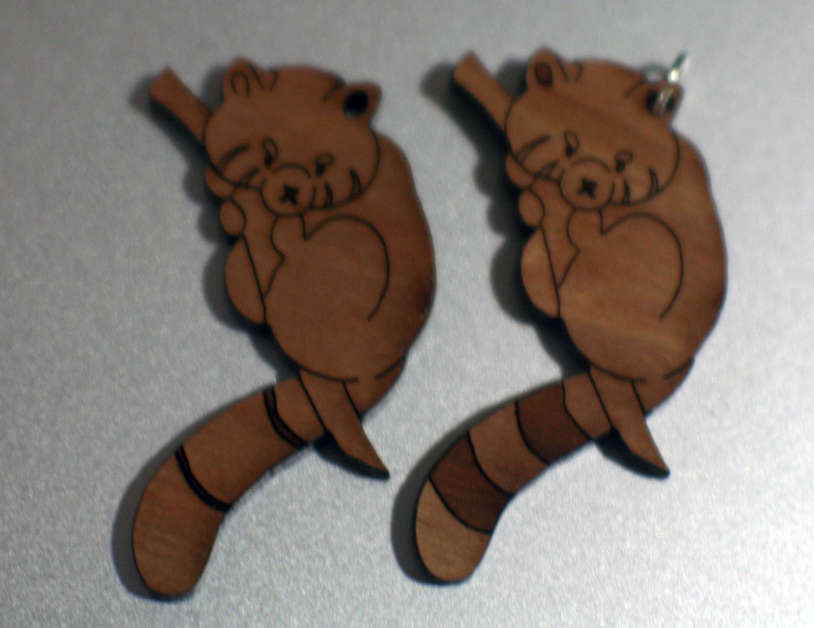 An example of what wooden charm board looks like after the charms and protective film has been removed. The utah raptor, llama heart, red panda, lucky cat, jackalope, tree sloth, raccoon, Kara full, Kara head, smilodon, leaf, and acorn charms can be found at Nattoshop or at conventions.The finished charms we made look fantastic. We used cherry-veneered MDF with mostly medium etching. The charms have a lot of character, and my shape nesting caused the grain of the wood to go in seemingly random directions, which I think looks phenomenal. The charms look solid and feel solid. A few people have sniffed them because they like the burnt wood smell, which mostly subsided over a few days. I believe MDF is toxic, so advise parents when buying for young children.