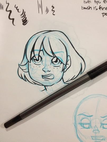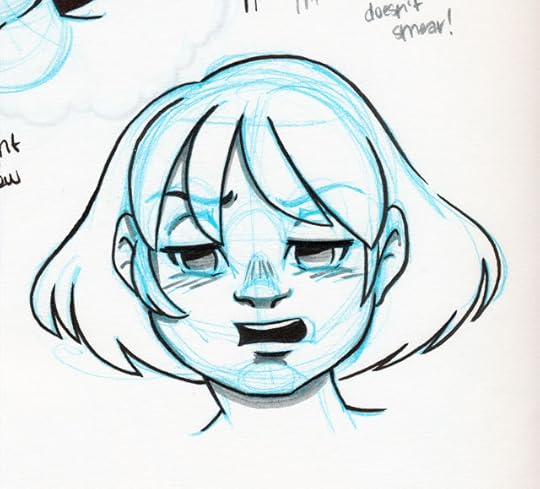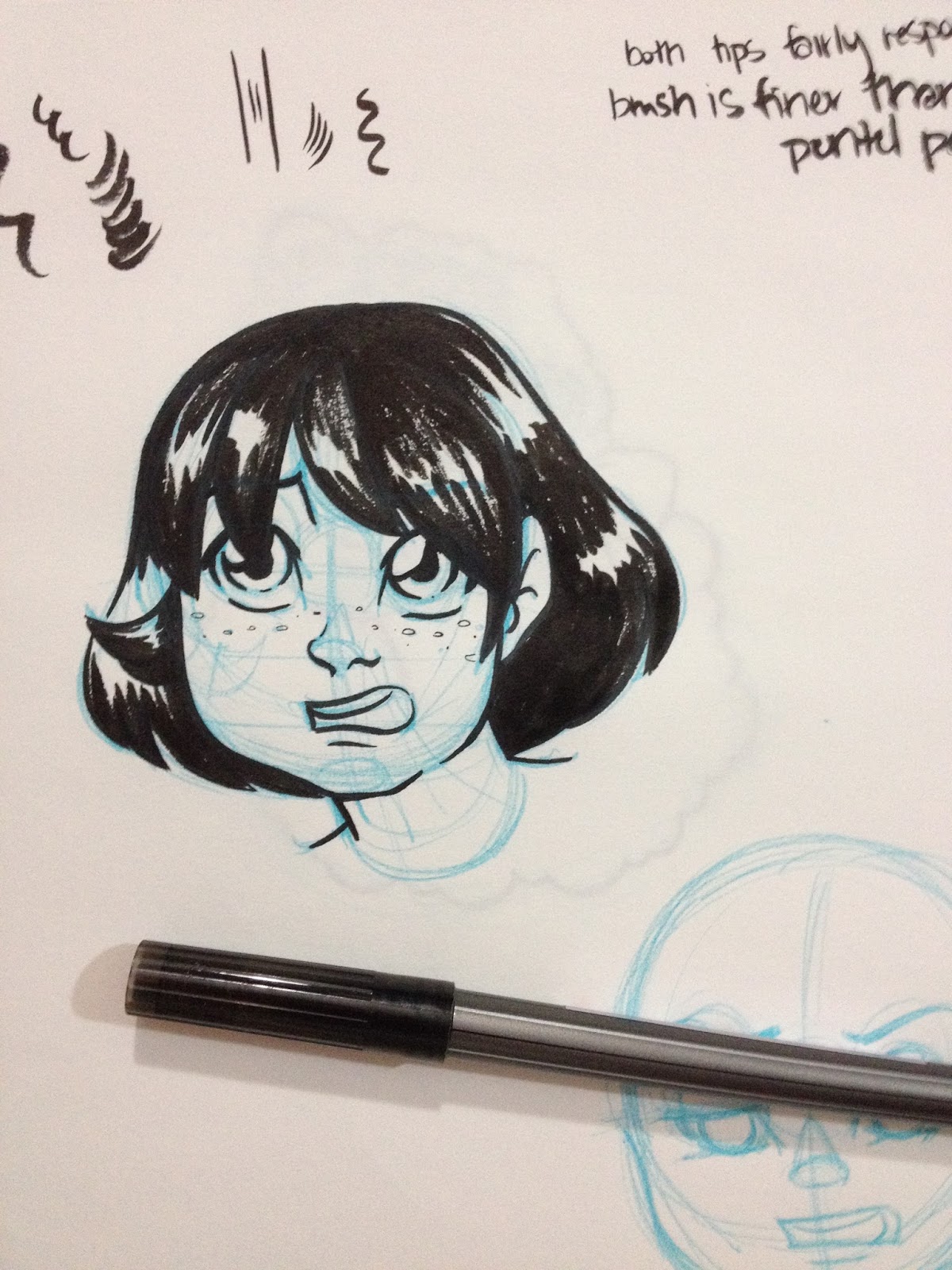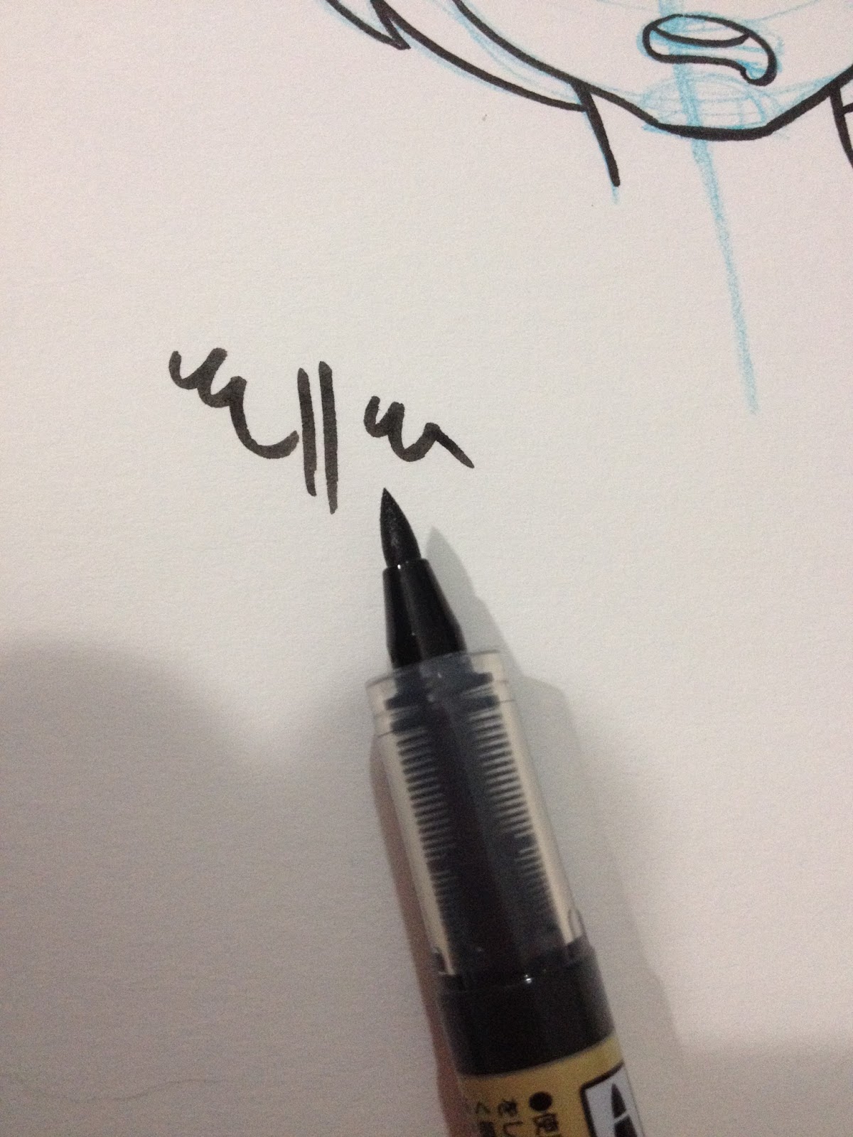 The Kuretake Bimoji Medium handles a little stiff- like a combination of a bullet nib and fude pen, rather than a true brush pen. The nib reminds me of the Kuretake Disposable Pocket Brush I tested awhile back, although it's easier to handle, it is already getting kinda mushy. There just isn't much snap to the fibers. Working with so many brush pens prone to mushiness, it makes me want to develop a sub-style that takes advantage of mushy pens. Something very simple yet cartoony, like the strip BC would benefit from a mushy pen. The Bimoji, however, is capable of very fine lines, the nib isn't so stiff that you can't push for dynamic bouncy lines, but I worry about pushing the Bimoji too much.