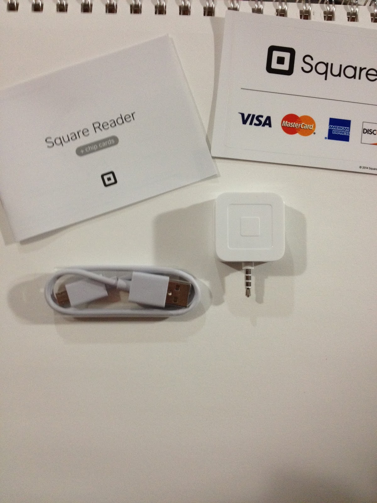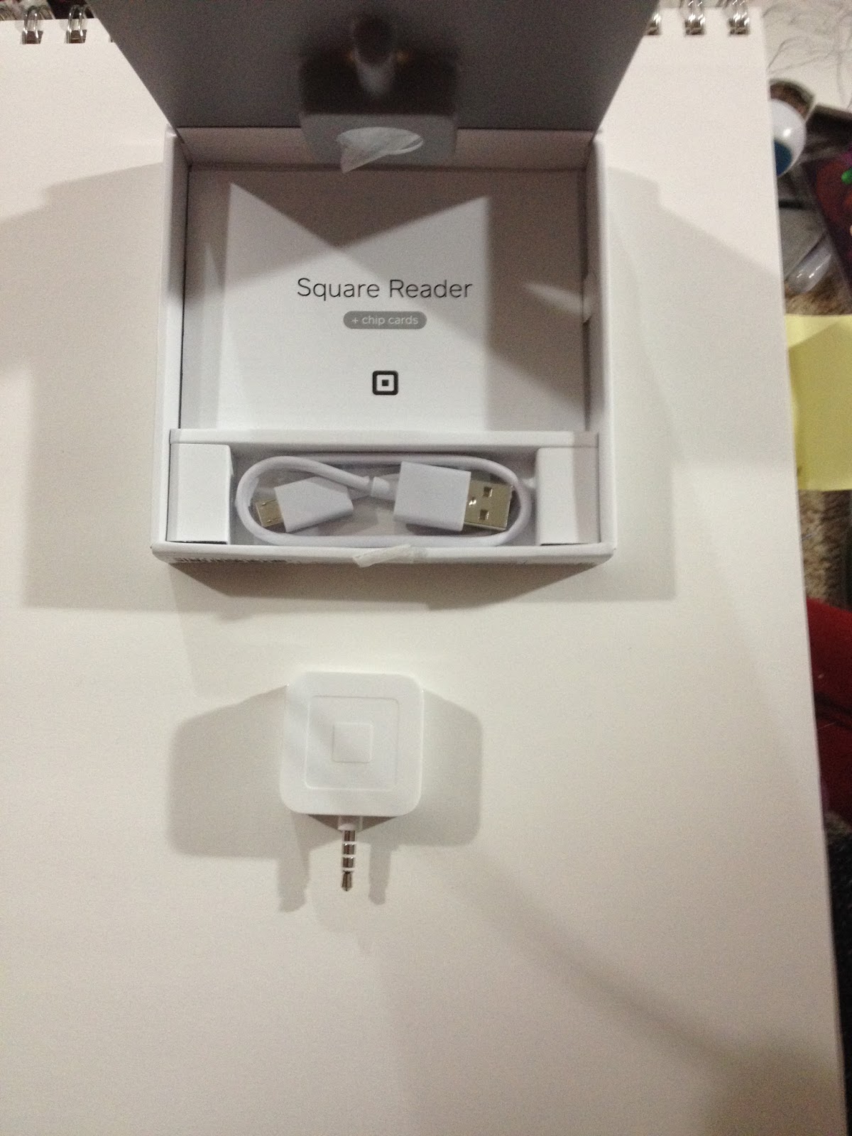The Square package disemboweled. The instructions, the charging cable, the stickers, and of course, the Square EMV reader.