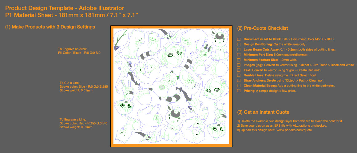 The larger an etched areaThe darker the etchingThe more laser cuts or etchesThe shaper the corners or the tighter the loopsThe more times you cut or etch over a lineThe denser the materialThat being said, your product has to be recognizable and distinct, so don’t go overboard pinching pennies. But keep in mind the minimum feature size is 1mm and the minimum object size is 5mm. So cutting around individual hairs will just burn all the material away and etching individual hairs will basically turn into an expensive etched area. Ponoko has a good post about simplifying a product to save on making time.