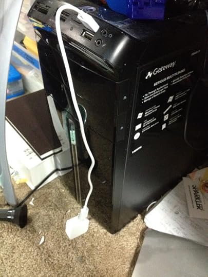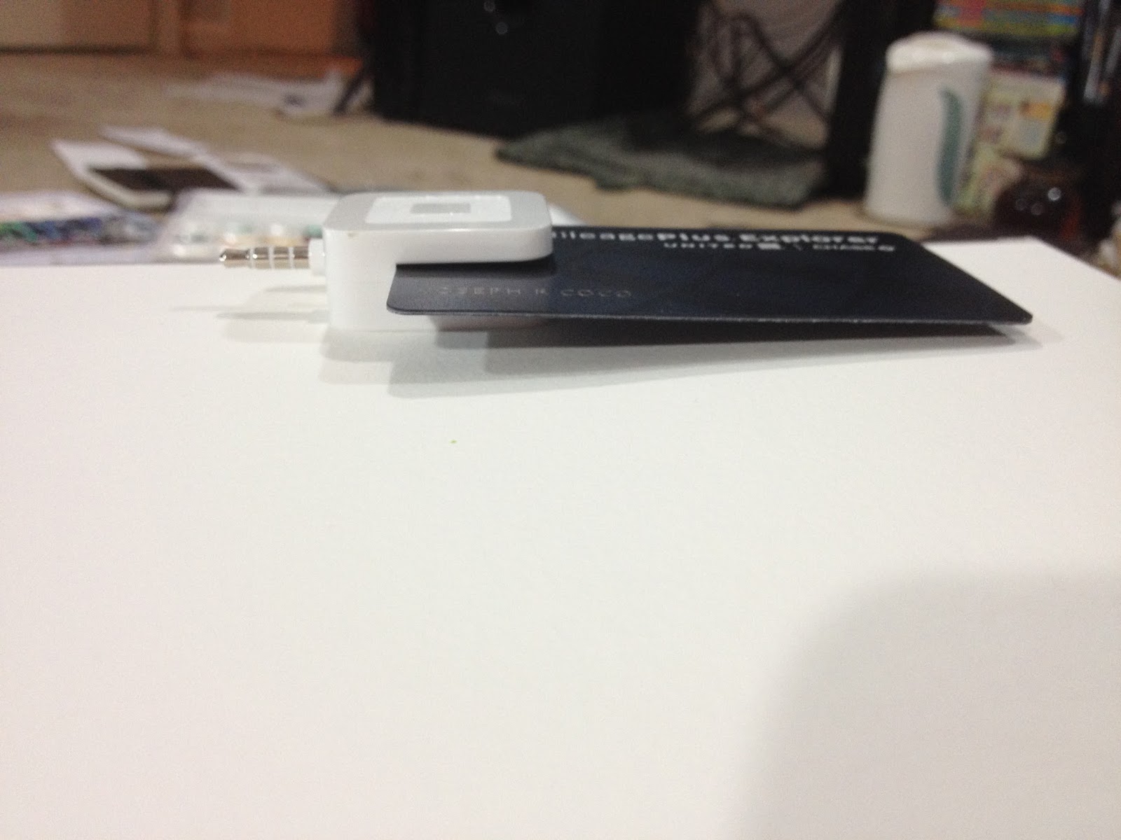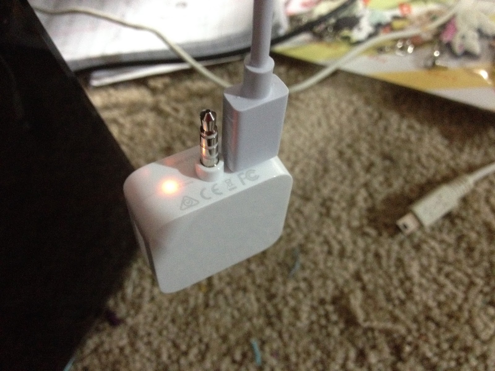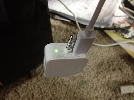 Excuse my messy apartment while I charge my Square reader with the short included cable. No indicator lights lit up when plugged in, so I had no idea if it charged or not until I plugged it into my phone. Even then, indicator lights didn't show, but having your indicator light on the BOTTOM of your product closest to where you plug it in is a stupid idea. I double checked to make sure, and I guess my light is just broken, because it didn't light up, but Square Register, the iPhone app, recognized my reader as being plugged in.