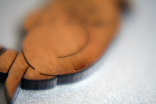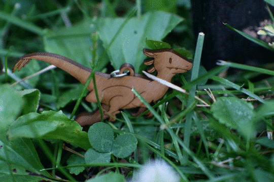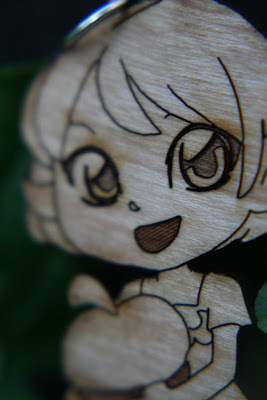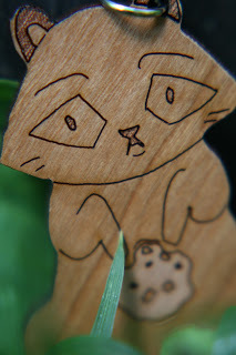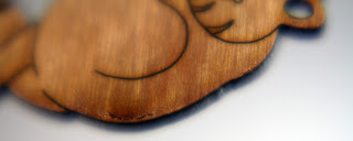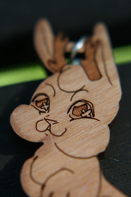 Close up of Becca's baby, Kara. Her eyes, dress, acorn, and legs are so cute! Check it out at Nattoshop.We forgot to thicken up the tails of the utah raptors which caused a few of their tails to break off. One or two of the products was difficult to remove from the template out of a couple hundred and around 4 of the cherry wood veneer charms appeared too pockmarked to be sold. So you can expect maybe 2% of your product to arrive in sales-bin state. Finally, the products hung well enough on their jump ring holes, but you should probably take the prototype phase to test how it hangs.