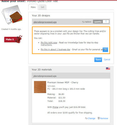 These Kara wooden charms are a bit on the elaborate side. They have two intensities of engraving, heavy and medium and many sharp edges in the hair, on the eyes, the dress, etc. But they look so adorable that it was worth justifying the cost. They also represent the 7" Kara line of graphic novels well and have served as great give-aways with the book.OrderingI would highly recommend you use your $20 off making coupon to make your first order, which should be a prototype of either cardboard or your desired material. Then, once you’re ready for your order, check how much it would cost to make your order. Look at Ponoko’s Prime membership program and determine how much it might save you to join the program for one month and get the discount on making. Take into consideration if the discount on making will drop you beneath the $100 free-shipping category.