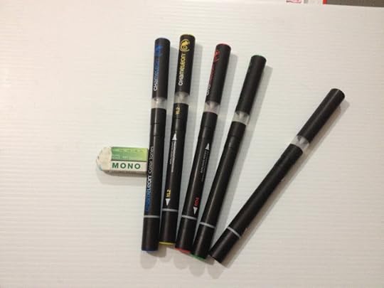 The Mono eraser isn't part of this review, other than as a stop to keep these markers from rolling all over the place. There is nothing on these markers to stop them from rolling all over the place- caps roll, markers roll, charging chamber rolls, and pretty much none of the caps post. You'd better keep a close eye on your markers and their accessories, because they'll just roll outta sight.
