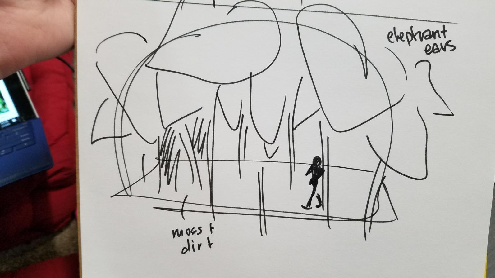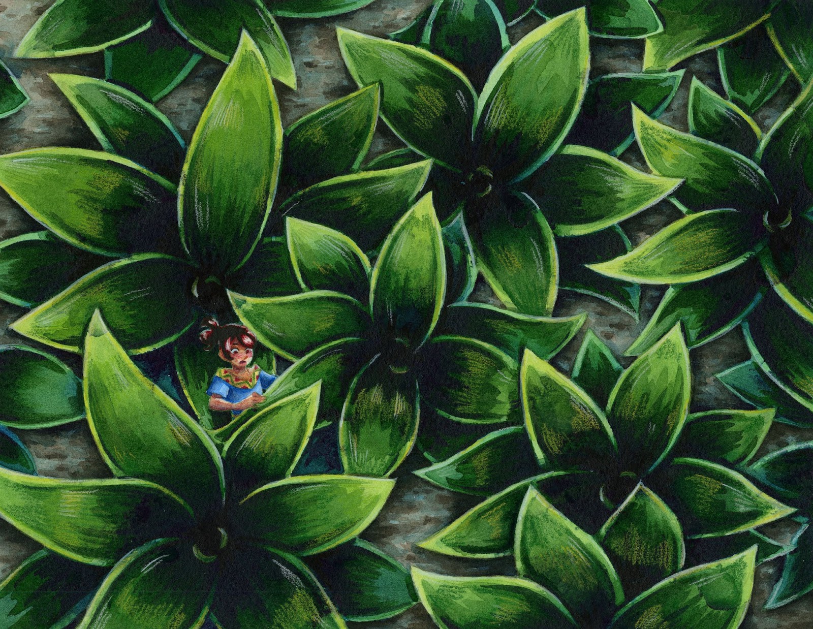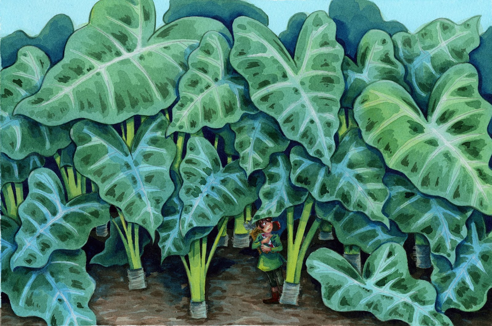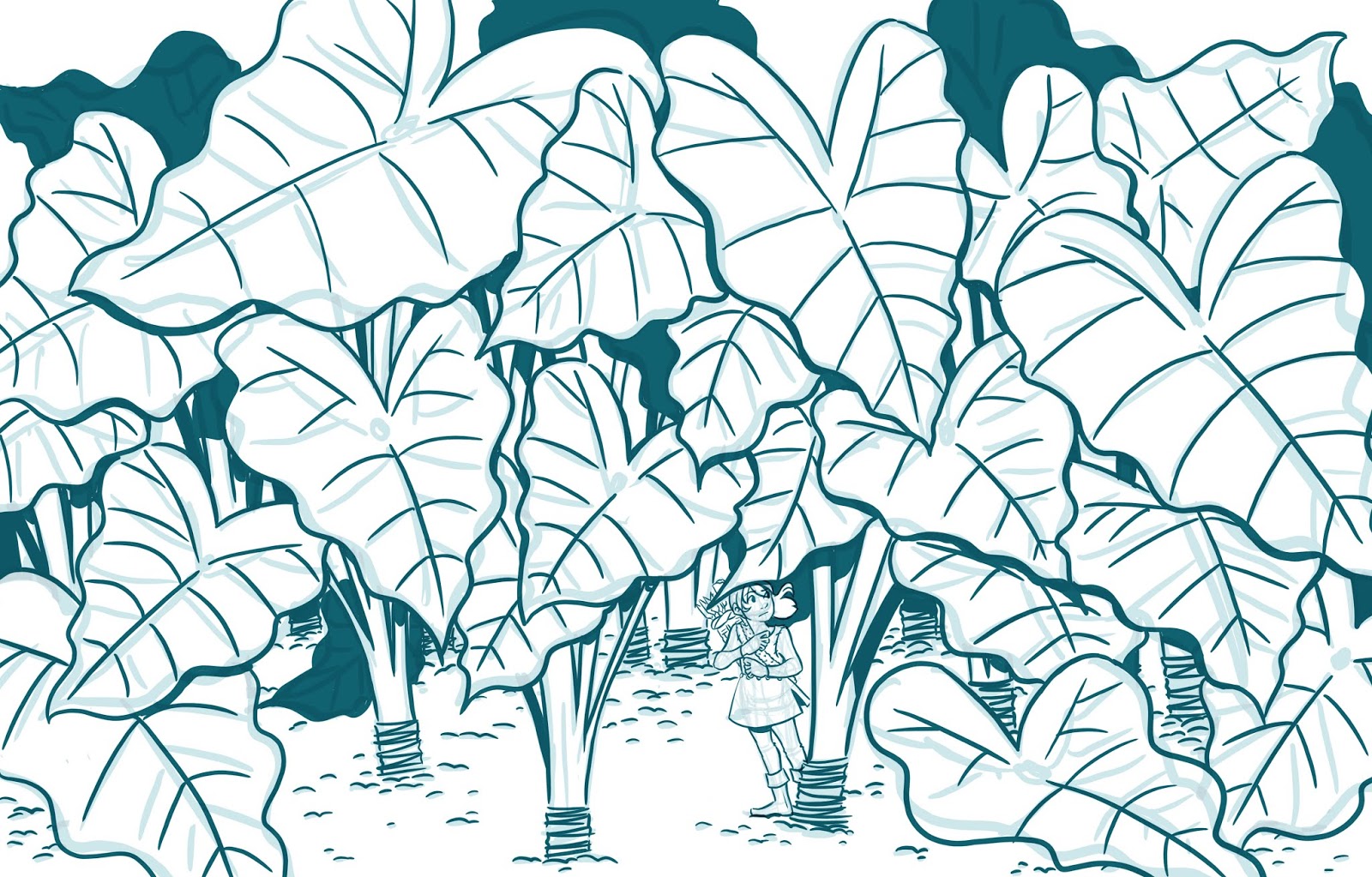 For the Elephant Ears piece, I really wanted to keep things light and fresh. Of the two, it was my favorite sketch and preferred concept- I really wanted to convey a sense of scale, a particular environment. I wanted the viewer to put themselves in Kara's shoes- what is it like to explore a yard? a flower bed?