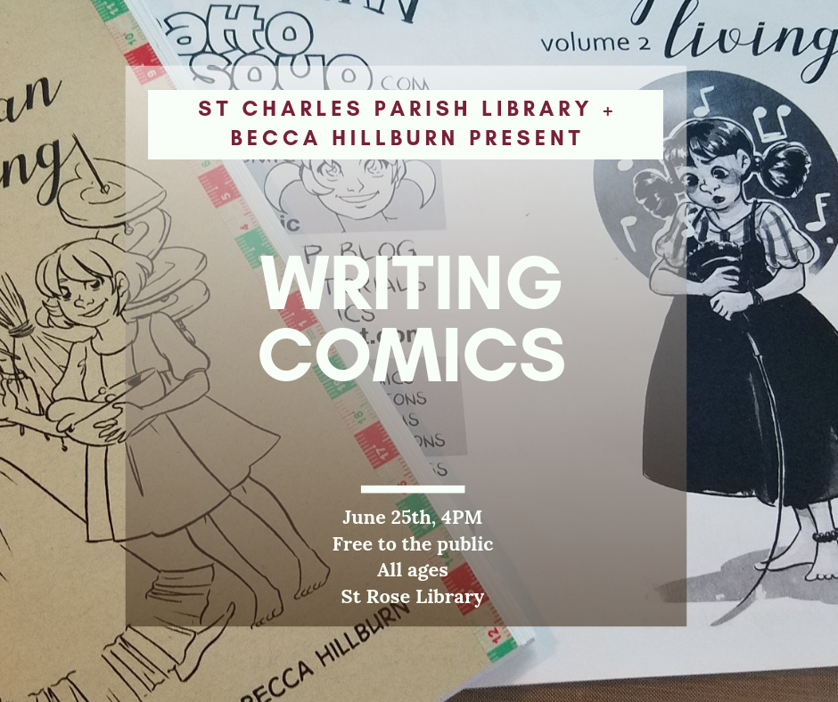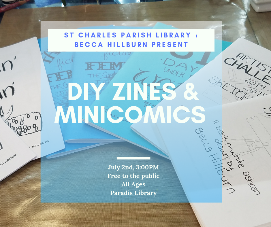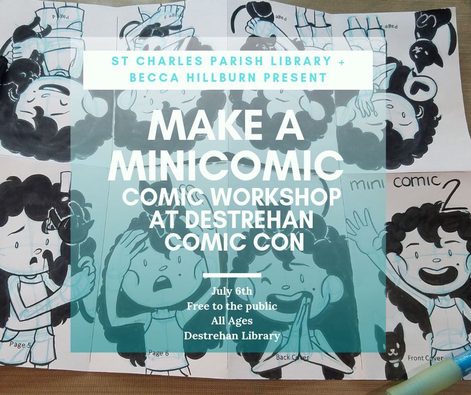 Learn the basics of assembling your own mini comic or zine, just in time for Destrehan Comic Con! You don't have to be an artist to enjoy this class- zines can include everything from collage to found objects!