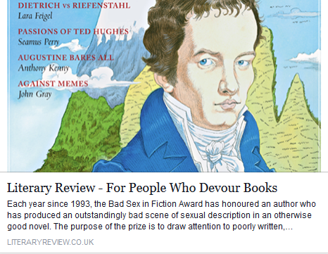 Good sex can be hard to write, or so it seems. It's certainly hard to please the critics, but then everyone probably has a different idea of what a good sex scene looks like, sounds like, reads like, feels like. It's become increasingly difficult to write sex in a novel without being mindful of the Bad Sex in Fiction Awards, and to not tremble at the knees slightly... in anticipation of being damned. These aren't quite the literary equivalent of the Darwin Awards, although they might feel that way to some authors. Nonetheless, there's usually a fair bit of purple prose floundering about in the nominated extracts, and they're always good for a read. Enjoy.