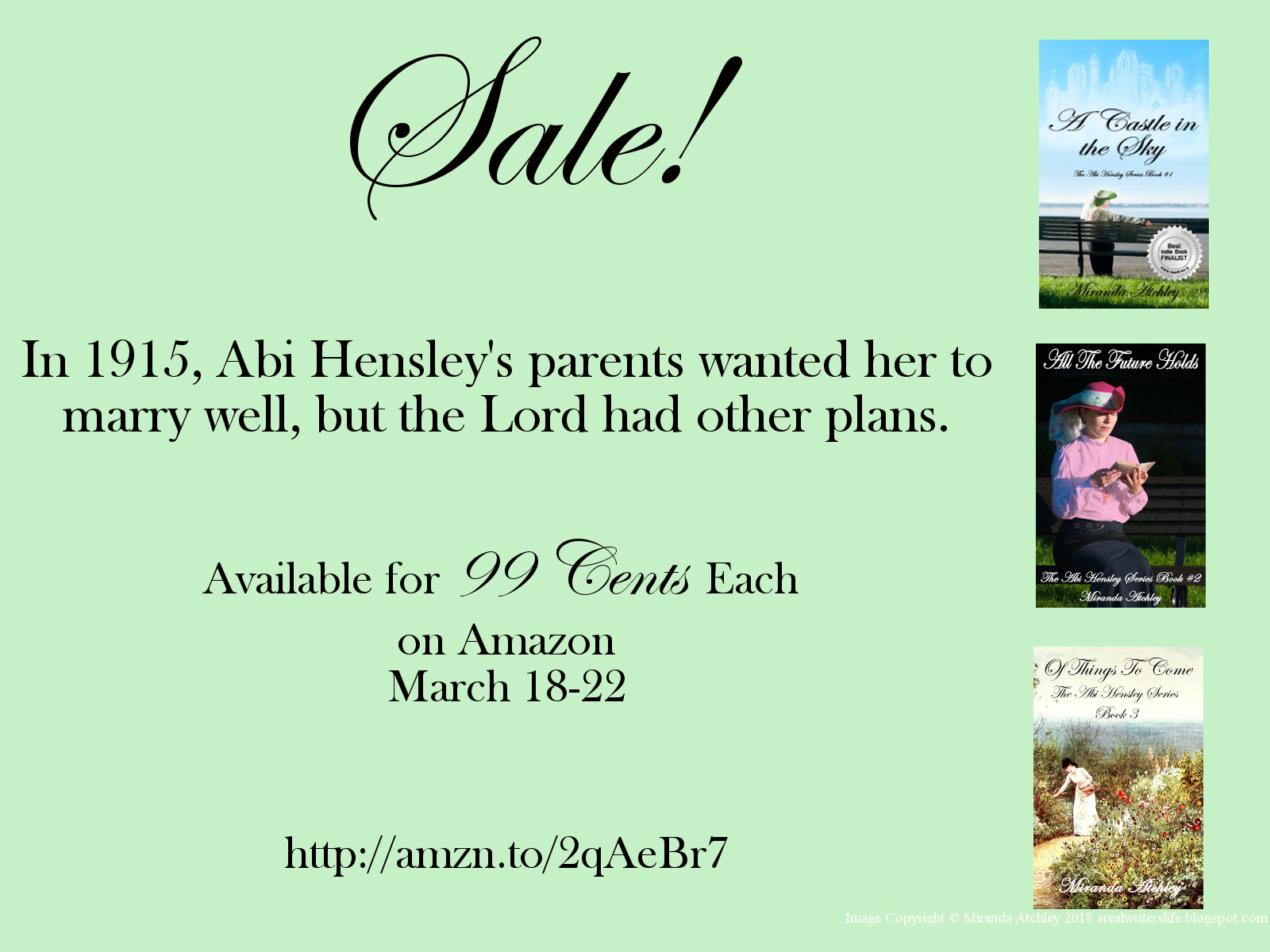 In celebration of this bookversary, I’m having two sales on my e-books this week. My young-adult novels, Stephanie’s Story , A New Season (sequel to Stephanie’s Story), and Misfit Like Me will be freeto download. My historical novels, A Castle in the Sky , All The Future Holds , and Of Things To Come , all part of The Abi Hensley Series, will be only 99 cents to download. Both sales begin today, Sunday March 18, and end on Friday March 22. So be sure to download these books at their discounted prices, and feel free to share about the sales with your friends!
