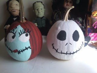 We had some pumpkins grow in back yard voluntarily this summer. They're pie pumpkins, so they're small. I painted a few, and my favorites are the Jack and Sally ones. The Nightmare Before Christmas is my favorite movie. I also painted one to look like a Jack-o-lantern with glow-in-the-dark paint.