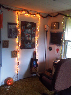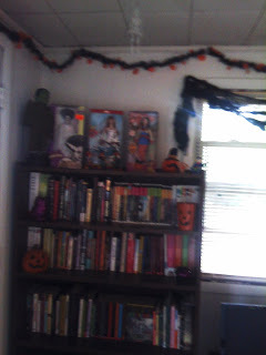 Good Sunday afternoon! It's a wonderful day where I am. Drizzling rain, cool temperatures.... absolutely lovely. The only thing that would make it better in my opinion would be if the leaves were already changing. Fall is definitely, without a doubt, my favorite time of year. I love the weather, the atmosphere, the festivities..... my birthday. ;-)I put out my Halloween decorations over the weekend. I love decorating for the holidays. It's so much fun. I buy most of my decorations at Dollar General and a few at Walmart and make what I can at home. I thought I'd share some photos of the decorations with all. They aren't that great because they were taken on my old (non-smart) cell phone, but you get the gist.