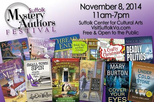 Join the Virginia is for Mysteries authors at the workshops at the Suffolk Mystery Authors' Festival on Saturday, November 8 from 11-7 at the Suffolk Center for Cultural Arts. I'm doing a workshop on the History of the Mystery with Teresa Inge and Maggie King.