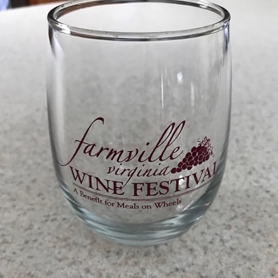 Last weekend, we attended the Farmville Wine Festival, a fundraiser for Meals on Wheels, in downtown Farmville, Virginia. The weather and the band were great, and our mystery anthology pairedwell with all the wines. It was a lot of fun to meet wine lovers and mystery fans. We quickly spotted the wine festival pros at the event. They sported a variety of wine glass slings or necklaces. One lady explained to me that a good one should be able to accommodate a stemmed or a stemless tasting glass.