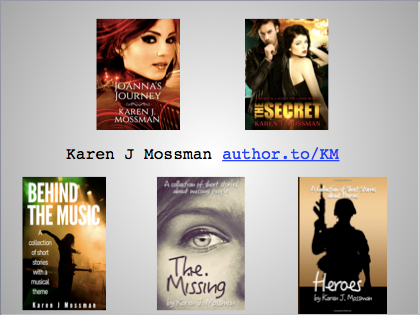Karen J Mossman lives in Anglesey in Wales with her husband. She had written 4 books, three themed short story collections, The Missing, Behind The Music, Heroes and Joanna's Journey, a novel set in the 1980s.