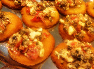 Tonight's appetizer was no different--I did make far more topping than the recipe called for (basically doubled it but tasted as I went and ended up not doubling the olives) and I still had to steal some from this one and that one at the end to make enough for all 16. Very easy, very fast and very good: Feta Tomato Crostini (click on title for original recipe...below is how I made it) 1 package crescent rolls2 tablespoons olive oil1 clove garlic, minced 2 Roma tomatoes, diced1/4 cup diced Kalamata olives (black olives; you can buy a small can of them already chopped up)1/2 cup Feta cheese, crumbled2 teaspoons olive oil1 tablespoon chopped fresh Basil leaves or 1 teaspoon dried (I used dried; rarely am I out of basil but I was today)