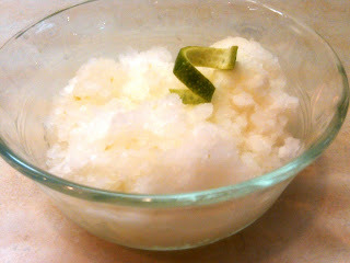 This one was SUPER easy, SUPER fast and very low in calories (1/2 cup is only 85 calories). That's my kind of dessert :-) I've never made granita before but now that I know how easy it is, I'll try other combinations. IMO, this also has a great presentation and is the perfect follow-up to a heavy dinner, so I'm putting it on my party menu list. Lime-Coconut Granita 2 1/2 cups water3/4 cup sugar1 tablespoon grated lime rind (I use a microplane)1/2 cup fresh lime juice (2-3 large limes or 4 small)1/2 cup lite coconut milkPut all ingredients in a saucepan over medium heat. Simmer 3 minutes or until sugar dissolves, stirring often. Remove from heat and cool completely. When cool, pour into a 9 X 13" pan. Cover and freeze for 8-10 hours, or until firm. Remove from freezer, let sit on the counter for 10 minutes, then scrape mixture with a fork until fluffy (it looks like sno-cone filler).