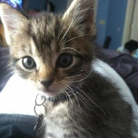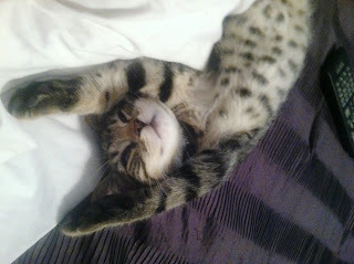 My daughter rescued a kitten that was in our drain pipe a few weeks ago, and I have to admit, he's grown on me. He's hilarious, and is best buds with my little Sophie. He doesn't the funniest things, and has already decided my writing chair is his nap spot :-) Here's a few pics of him. The first one is when we first found him, and the second is a few weeks later, and is the way he sleeps :-)