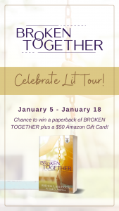 From January 5, 2022 – January 18, 2022, BROKEN TOGETHER is touring the blogosphere with Celebrate Lit! Visit the blogs on the tour (listed below) to find out how you can enter to win a paperback copy of Broken Together PLUS a $50 Amazon gift card!