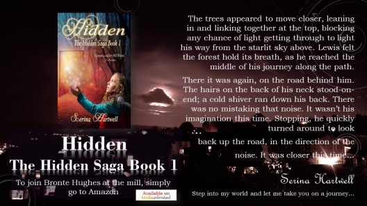 Allow me to take you on an emotional rollercoaster – Step into the world of Bronte Hughes and open yourself up to mystery, secrets and danger. If you would like to get a feel for The Hidden Saga, here is a link to an image board I put together to help me write the saga. Just follow this link to see what inspired me – https://in.pinterest.com/serinahartwell/hidden-httpwwwserinahartwellcom/ Don’t forget to share your thoughts and leave me a review on Amazon and Goodreads. I can’t wait to read what you think.