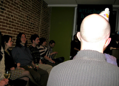 Then Father Young took the stage among confetti poppers and promises of cake at the break in honor of this night being the first anniversary of the Artichoke Haircut launching.