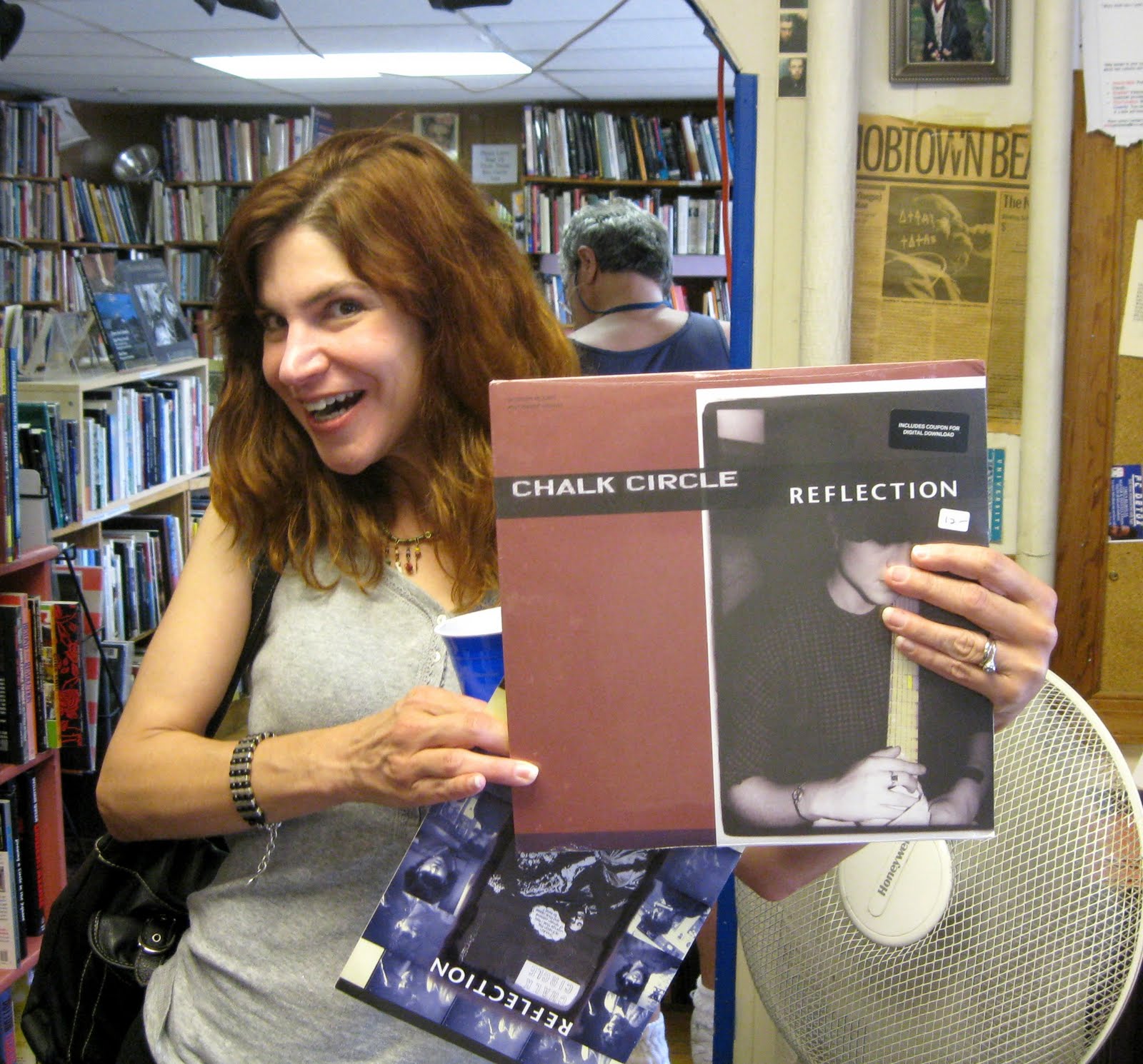 Probably the biggest surprise of the day was the appearance of former DC punk rocker and former Baltimore maneater Anne Bonafede. Back in 1982 when I first met Anne I was in a group called Neighbors' Children and eaten up with jealousy over Anne's old band Chalk Circle. They played one show and were on some WGNS cassette compilations and they were legendary!!! Anne played a wildly pounding poly-rhythmic drum battery while her best pal Sharon Cheslow (The Chez) beat out unpredictable chords on guitar. As fate will occasionally throw us a good bone while wars spread like wildfire and wildfires spread like Mid-East wars, the amazing Oregon label Mississippi Records somehow found out about Chalk Circle (perhaps Ms. Cheslow's current notoriety in the LA free music scene?) and has released a full length lp of what is probably their entire recorded history, along with a generous beautifully done large booklet. There is a hilarious part in the booklet where Don Fleming of Velvet Monkeys and Dim Stars relates how he was blown away by catching Chalk Circle live. He approached Bonafede (who at that time looked like a cross between young Linda Ronstadt and The Cheshire Cat) and said that surely she must have been studying African poly-rhythmic drumming or something to come up with her unique style. Anne guilelessly responded that no, she was inspired by Tony DeFranco's "It's a Heartbeart, It's a Lovebeat".