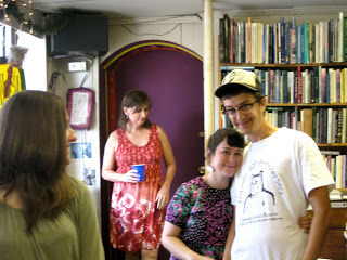 Poet and curator of the WORMS reading series, Bob O'Brien, took on the burly crowd after Walker & Jay and Spacecrafts and Insects performed. He read a new version of his piece on war and responded to a rowdy voice in the crowd at one point, "Nothing you say will be as interesting as what I have to say because I've had time to revise it". Robert knows how to stand his ground with a crowd and work them into a frenzy of worship and he's also spent some serious time behind the counter at Normal's explaining to befuddled folks that no, we are not a martial arts center and we don't sell swimsuits or plastic owls for scaring away pigeons. And my favorite, back when we briefly had the two split in two spaces across the street from each other, a gentleman asked me while I was in the basement book side if I would hold his crack 8-ball behind the counter while he worked his sales pitch out on the street. And without even any enticement of a cut! Just putting neighborly guilt/pressure on me!