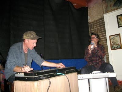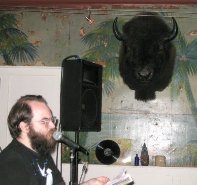If I achieve nothing else in my seedy life, I am at least amassing a good collection of photos I've taken of Baltimore poet Chris Toll, who has a brand new book out on Publishing Genius, cheerily raising a beer. Here he is beside Asa of Zomes and legendary Lungfish. Asa closed out the night with a fine set performing with Professor Andy Hayleck who lives a block or two from Normal's. If you are a scalper stalker who sells stolen human hair, it would be hard to beat the dark flaxen wig of Hayleck. Andy and I believe a woman named Jordan (Jordie?) were in the early format of Zomes.