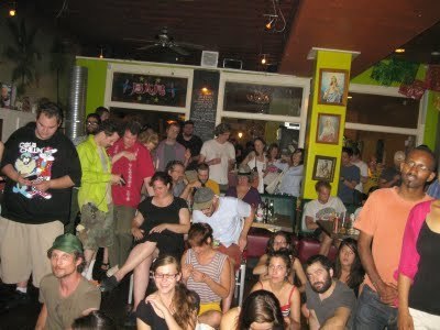 Here is one chunk of the crowd right after Bob's reading. I spy T-Dogg Duggan and Bob of the Junkyard band and at least three registered sex criminals.