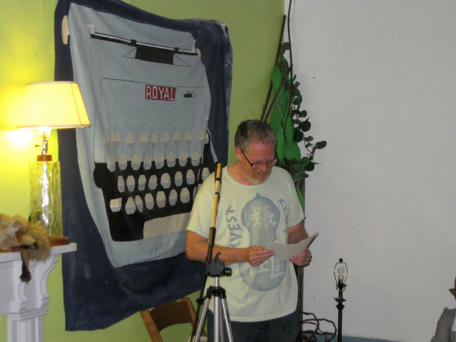Below is host Chris Toll engaged with the sweet Lynchian retro microphone. Co-host Barbara DeCesare was occupied peering in the window of a wedding reception in Red Lion, PA that the Elvis impersonator she is stalking was performing at. The day was somewhat bittersweet because now that I'd finally caught a reading at the nice new space it turned out to be the last one of the season until September or October.
