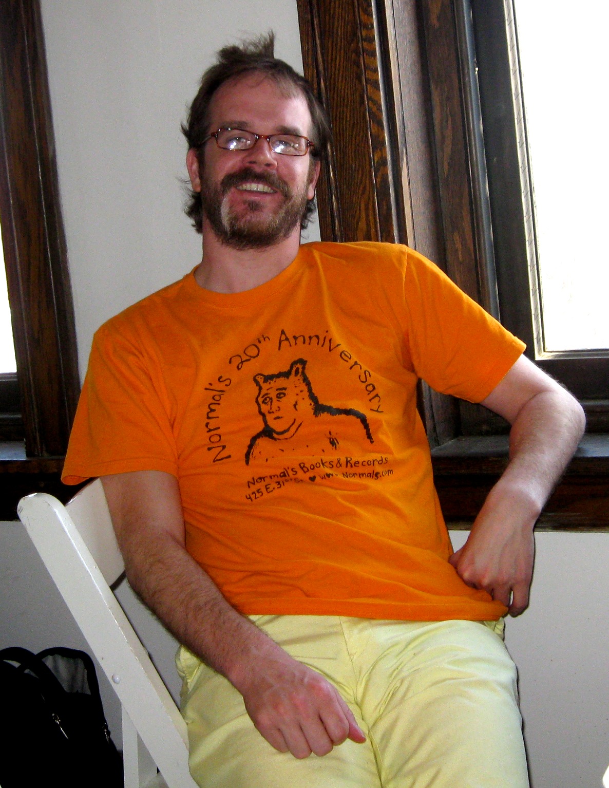 (Above is audience member and publishing mogul Adam Robinson sporting a handsome Normal's Books & Records 20th Anniversary t-shirt). Megan's reading was followed by a brief question and answer period and then Stephanie Barber joined Megan for a reading of some great collaborations they had done. Hopefully at the bottom of this post is a working video of this portion of the reading. (It has now been about an hour and the video hasn't loaded so I'll try a separate post for it tomorrow).