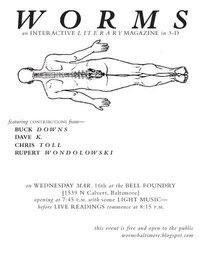 WORMS is the name of an event billed as "an interactive literary magazine in 3-D." Every month, typically on a Wednesday, the basement of the Bell Foundry is opened for an evening of spoken word and other shenanigans. The evening's host and editor, R. M. O'Brien, usually begins with an introduction that is two parts editorial and one part late-night showbiz. For the most recent incarnation of WORMS, O'Brien read from the letters of Saint Patrick, in honor of what O'Brien referred to as "the day the Irish celebrate the demise of their ancestral religion." He mentioned the snakes, which are like worms, that Saint Patrick is said to have driven out of Ireland, the snakes that never existed there, that is. Someone heckled, "except for the two-legged kind." This is an unusual sort of editorial, performed on stage; interactive, and although any editorial might be enjoyed with Natty Boh in a basement, these can be enjoyed in the company of a wriggling, live audience.