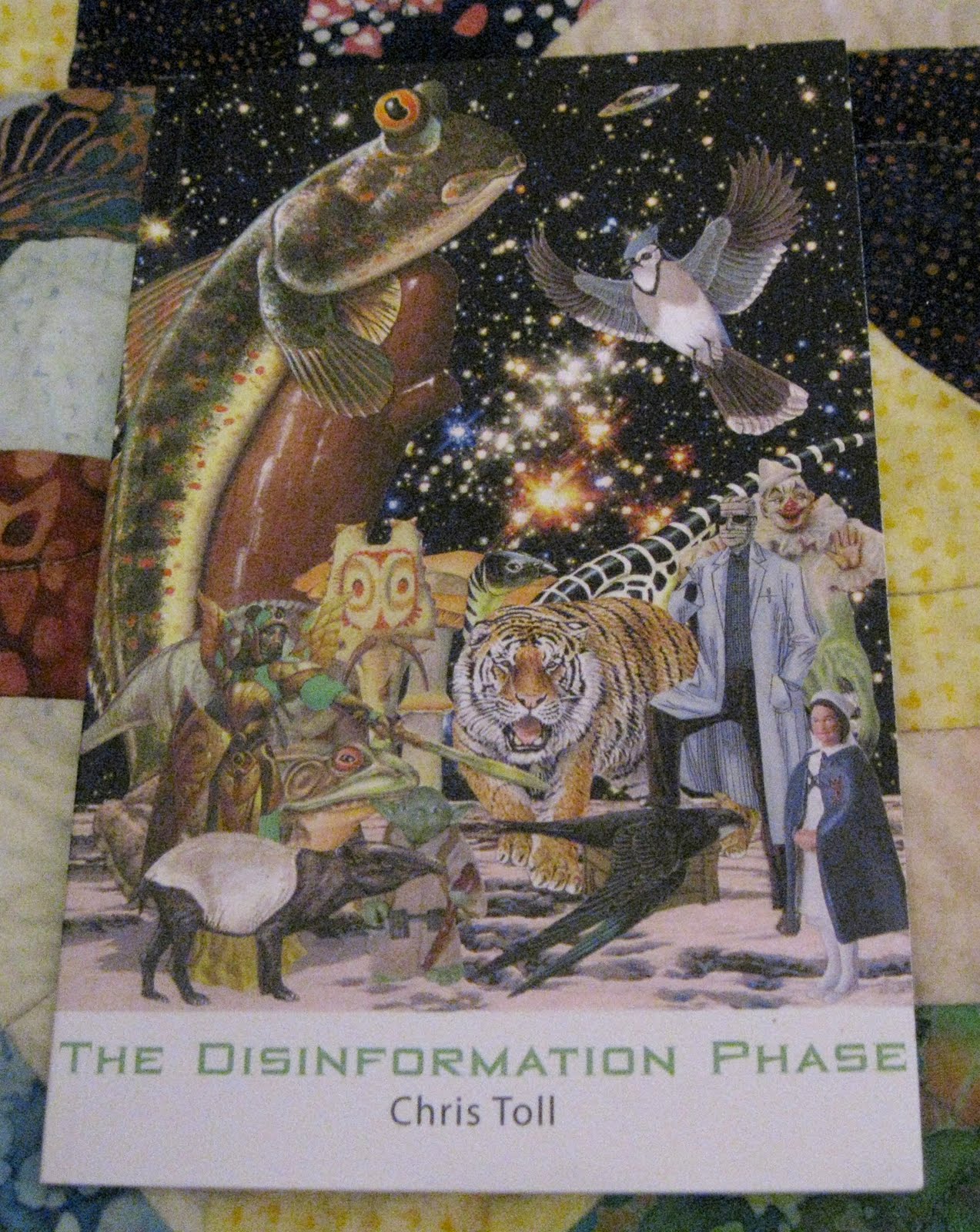 Photo by Tedd Henn Chris Toll was the first performer who read from his forthcoming book, from the Publishing Genius press, The Disinformation Phase. This performance was also filmed so that it could be used for promotion. You shouldn't judge a book by its cover, let alone its author, but just this once, let's do exactly that. The landscape on the cover of this book depicts the surface of another planet. That planet is inhabited by a clown, a tiger, a giant amphibious creature straddling something that looks like a cactus, an aardvark, a nun, or perhaps a nurse, a tiger, the invisible man, two different species of birds, Yoda, a flying saucer and yes, a snake, which is like a worm. The poetry of Chris Toll is just as imaginatively populated as this tableau. It is populated by unusual imagery, from which the cover is derived, no doubt. The poetry is also populated by Toll's startling inquisitions of the language. For example, in a poem entitled Why is Try in Poetry the question is posed: "why is love backwards in evolve?" The title and that line are just two examples, among many, where Toll playfully examines the presence of one word within another.