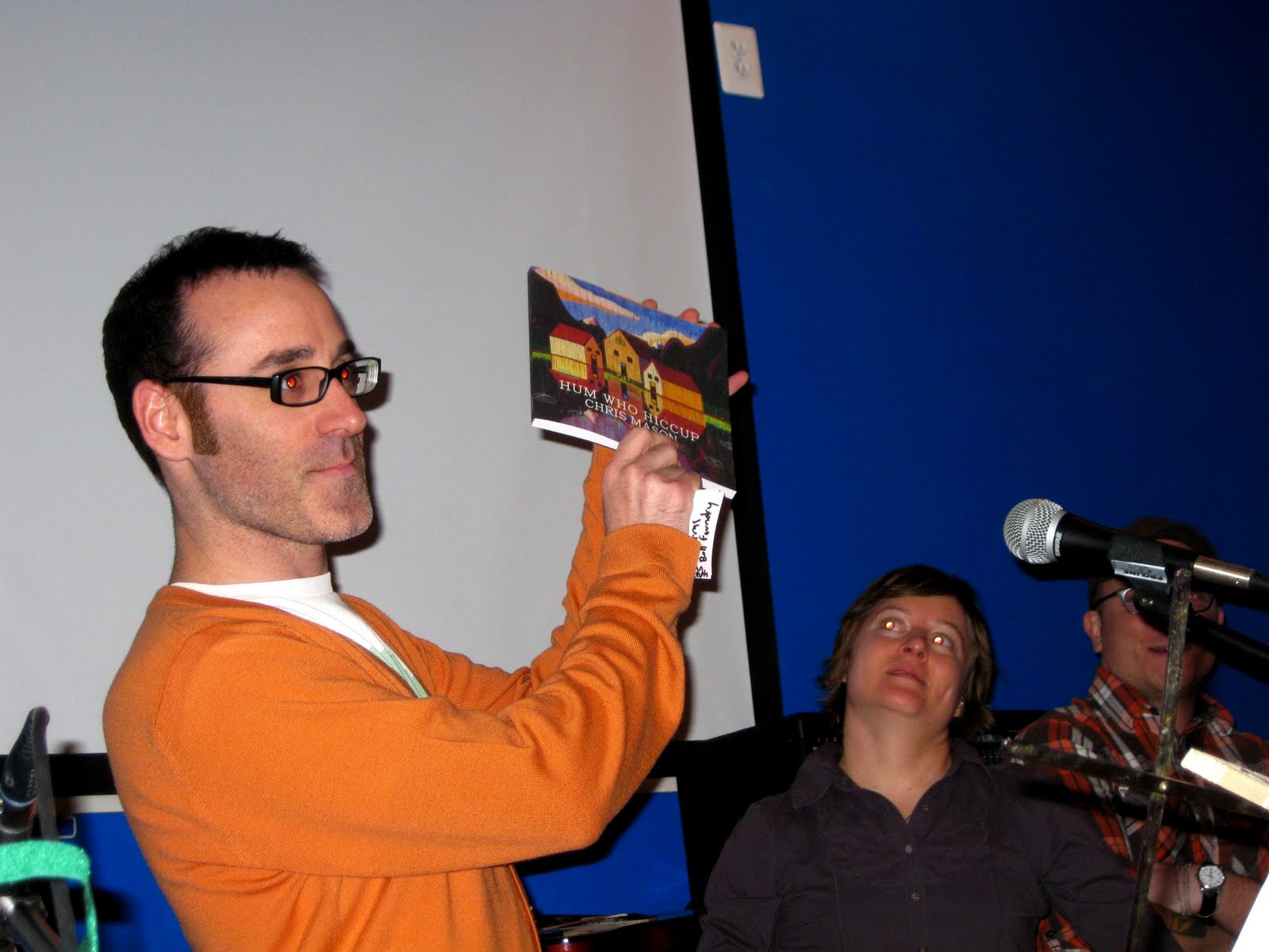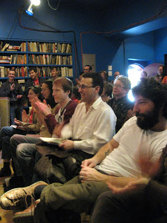 Above are proud Narrow House publishers holding the fine new book, which contains most if not all of his poetry from the last decade or so, including his dreamt poems of poet friends, "Homeric Hums" and the beautiful spare "Hiccups" themselves. As Jamie Gaughan-Perez held the book up someone yelled out "Lauren Bender, if the book is as good as you say and you are truly so proud of it, pose as if you are hypnotized and being forced to stare at the nude engorged wang of Mel Gibson with a small anvil attached to it". And indeed she did.