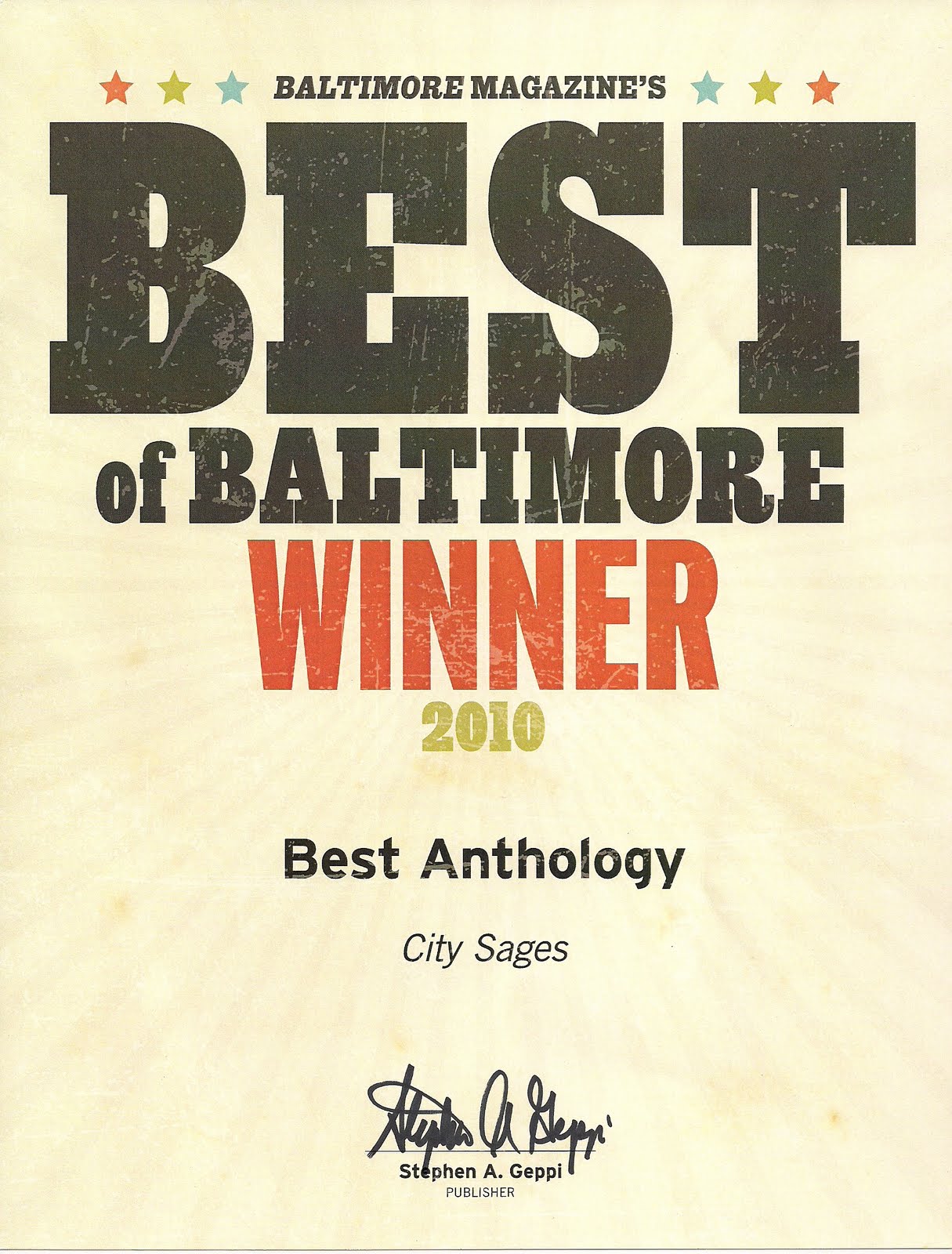 City Sages: Baltimore, the first publication from CityLit, edited by hard working Jen Michalski, has won "Best Anthology" from this year's Baltimore Magazine's Best Of issue. The anthology collects pieces from dead and legendary Baltimore authors like Mencken, Poe and Gertrude Stein, the living and famous like Anne Tyler, Laura Lippman and Madison Smart Bell and the young and young(ish) turks like Michael Kimball and Adam Robinson.