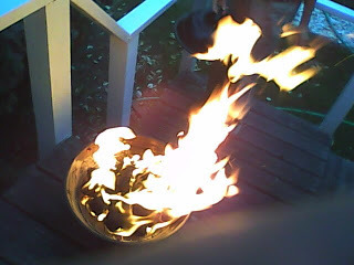 Pictured at left is our little Vortex grill transported to Chincoteague Island so that Lady Rio could whip up on some steaks. And indeed she did. This was on Monday night, our second night there, and soon after these roaring charcoal flames got going storm clouds brewed and in about an hour the overbearing 100 degree days collapsed into the gentle mid-'80s and stayed there.