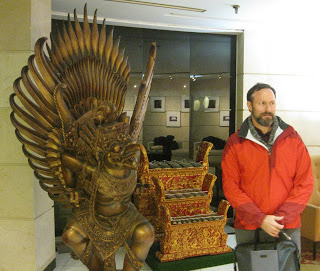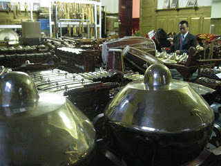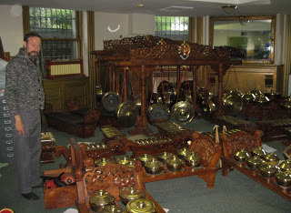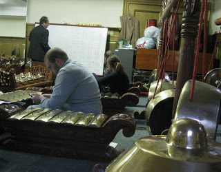 Peter took me with him to the Indonesian Embassy one day to play their gamelan. This happens once a week on Mondays. I expected we'd go there, walk around the instruments, marvel, tinker a bit. Instead a wired Indonesian conductor who seemed very excited to see us, but grew perhaps increasingly, delicately frustrated with a few us, immediately assigned us a part of the gamelan and then explained in broken english a numerical notation song system that he would write up on the chalkboard.