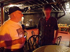 (Above - Blaster's most beloved and long running collaborator, editor of Lost and Found Times, John M. Bennett blowing Batworth's mind before the show).
