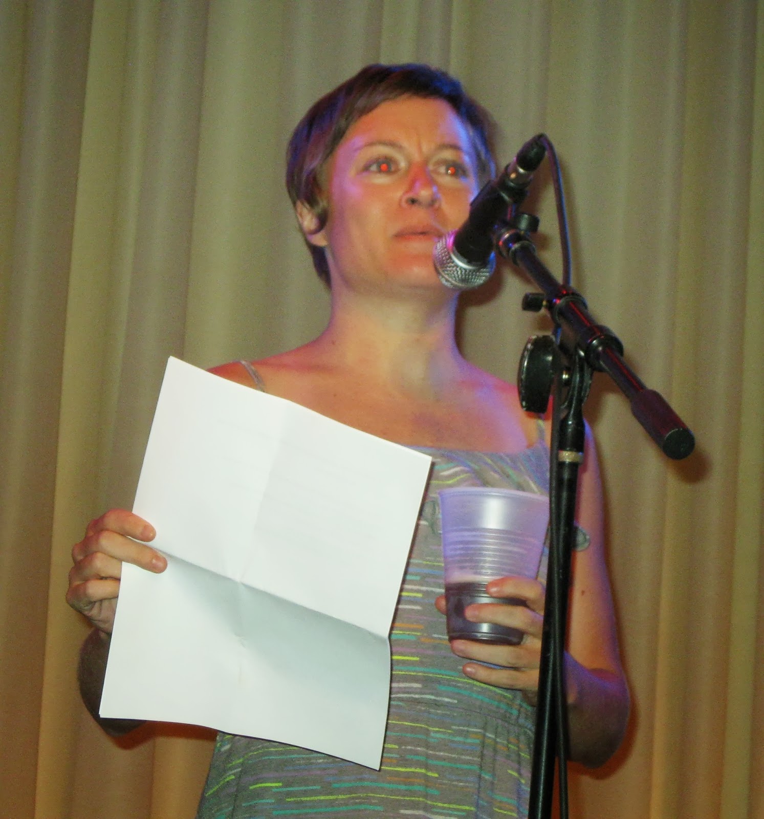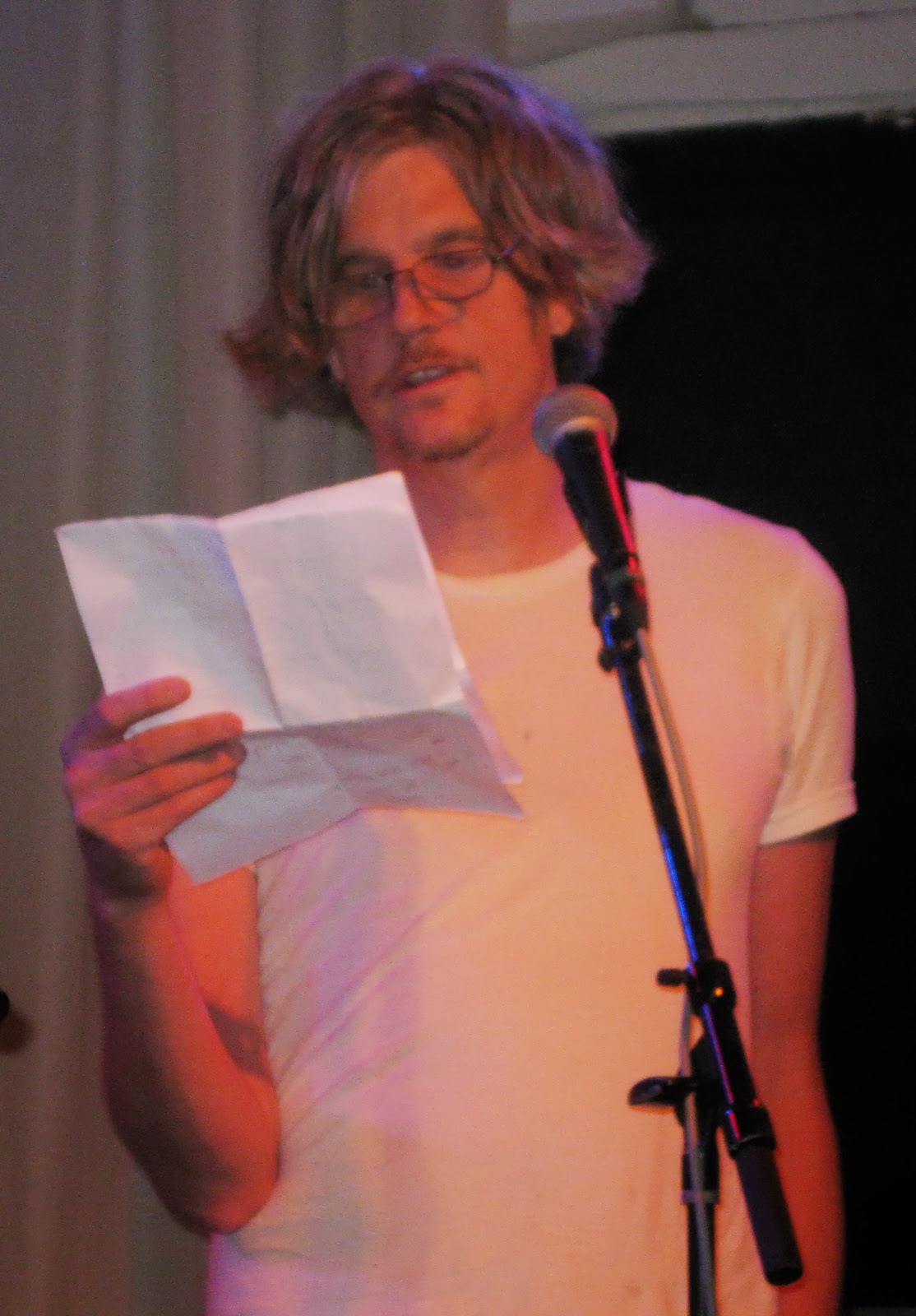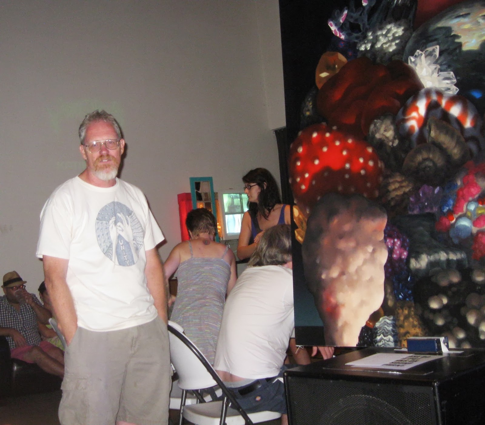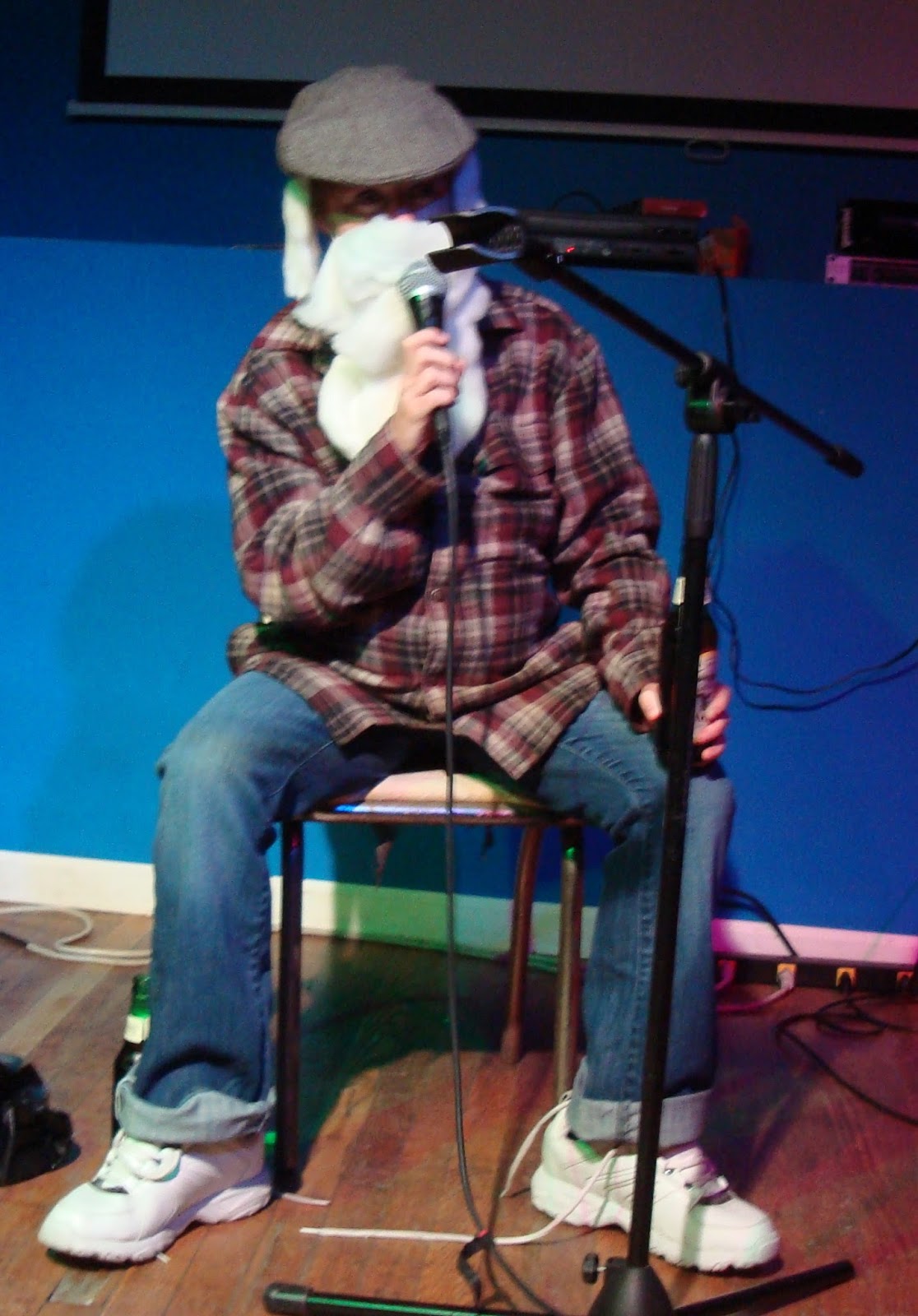 The Mole Suit Choir was honored to be part of the proceedings and put together a musical arrangement of Bob's haunting poem "Increasingly Virtual Worlds". The set was a blast and went well once the soundman helped me set up a truly annoying new musiv stand with a spring action neck. After our set Wheatie asked to borrow it and she, Dan Dorsey of Sea Couch and I could not get the flimsy legs to stand up. It's called something like a "touring stand", for the musician on the road who needs that one last nagging hitch to drive them over the edge.