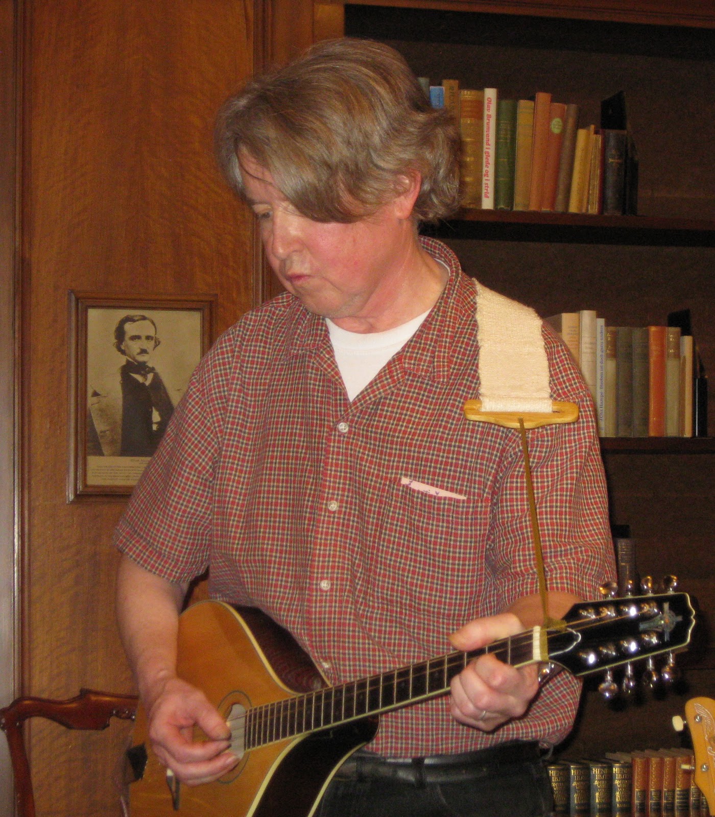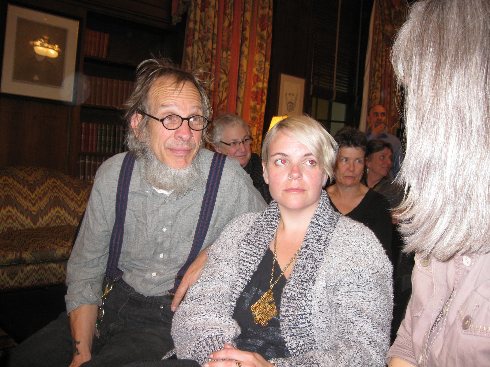 Above - Longtime meritorious cultural warriors Chris Mason and Liz Downing have a serious moment of sinking into the gravitas before belting out one of their all time best Old Song sets within the lush tome-lined walls of the Enoch Pratt Library's Poe Room.