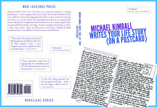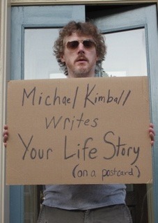 Michael Kimball Writes Your Life Story (on a postcard) started five years ago at a performance arts festival. Between then and now, I wrote over 300 postcard life stories, condensing over 10,000 years of life. Now it's a book. You can get it directly from Mud Luscious or from Amazon. Unfortunately, I couldn't publish everybody's postcard life story in the book or it would have come in around 700 pages.