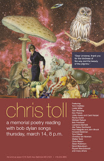 One brisk chilly September night we stood together in the parking lot behind Dunkin' Donuts as he played me the two available songs from Dylan's upcoming "Tempest" album on his iPhone and a little over a week later the great poet and my old friend Chris Toll was dead. Here is his obituary: