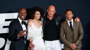 Actors Tyrese Gibson, Nathalie Emmanuell, Vin Diesel and Ludacris attend The Fate Of The Furious New York premiere at Radio City Music Hall in New York.