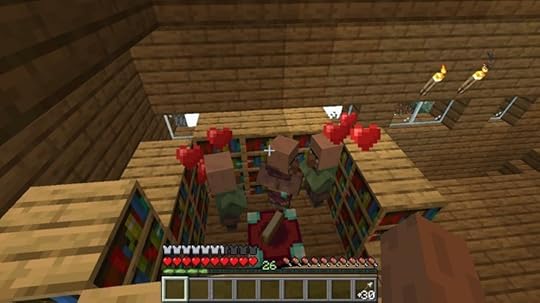 The characteristic inventory menu from “Minecraft” sits along the bottom of the screen, but the rest of the screen is consumed by the world of “Minecraft.”A very pixelated pig marches around in mud, and a few of the game's villagers show up to take a look.